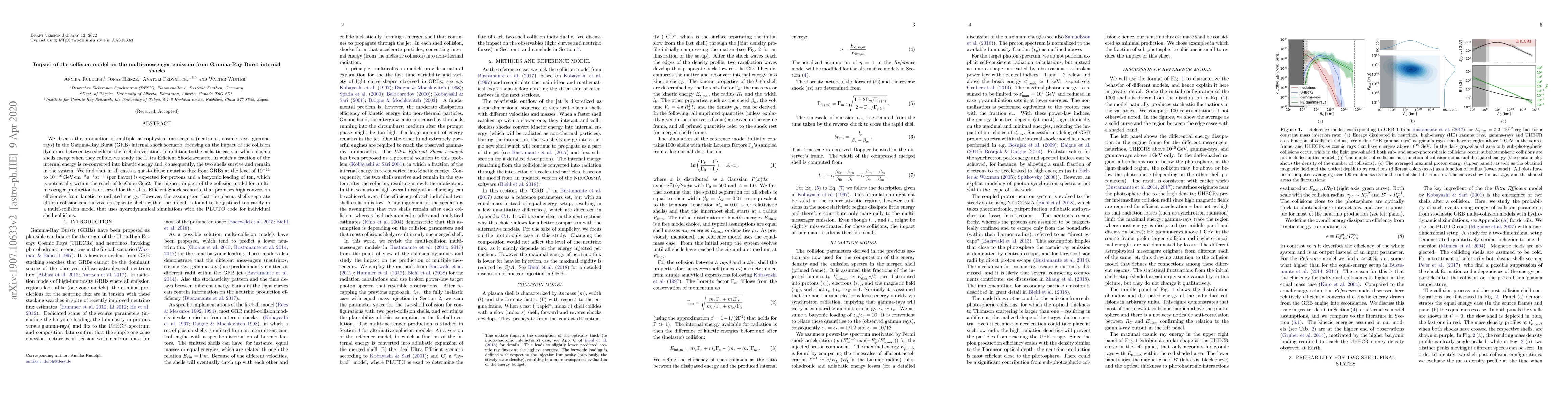 We discuss the production of multiple astrophysical messengers (neutrinos, cosmic rays, gamma-rays) in the Gamma-Ray Burst (GRB) internal shock scenario, focusing on the impact of the collision dynamics between two shells on the fireball evolution. In addition to the inelastic case, in which plasma shells merge when they collide, we study the Ultra Efficient Shock scenario, in which a fraction of the internal energy is re-converted into kinetic energy and, consequently, the two shells survive and remain in the system. We find that in all cases a quasi-diffuse neutrino flux from GRBs at the level of $10^{-11}$ to $10^{-10} \, \mathrm{GeV \, cm^{-2} \, s^{-1} \, sr^{-1}}$ (per flavor) is expected for protons and a baryonic loading of ten, which is potentially within the reach of IceCube-Gen2. The highest impact of the collision model for multi-messenger production is observed for the Ultra Efficient Shock scenario, that promises high conversion efficiencies from kinetic to radiated energy. However, the assumption that the plasma shells separate after a collision and survive as separate shells within the fireball is found to be justified too rarely in a multi-collision model that uses hydrodynamical simulations with the PLUTO code for individual shell collisions.
