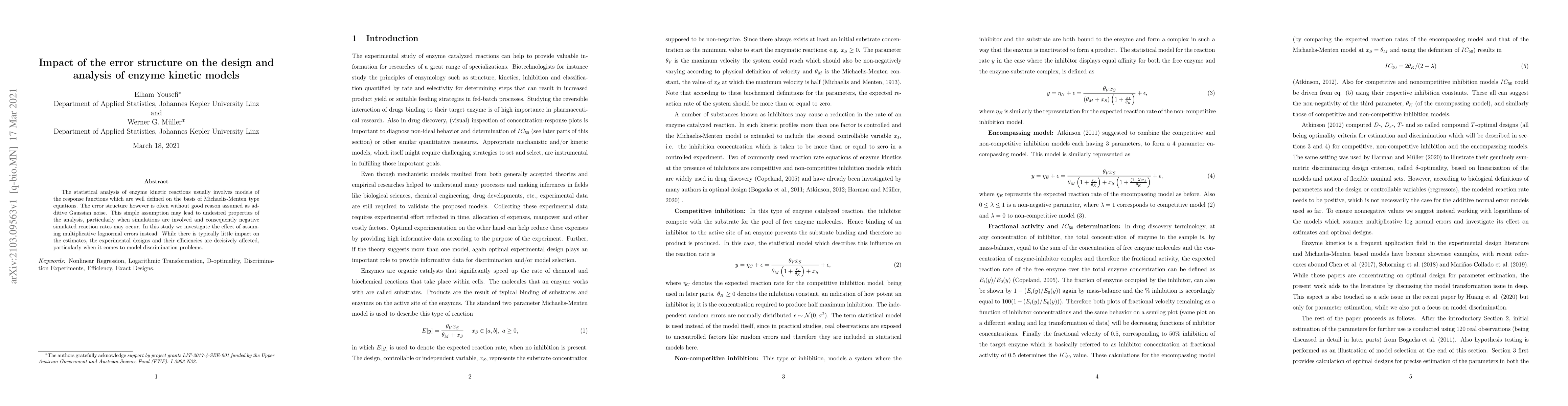 This study examines the impact of different error structures on enzyme kinetic model design and analysis, revealing that assuming multiplicative lognormal errors instead of additive Gaussian noise can significantly affect experimental design efficiency, especially in model discrimination. While estimates remain largely unaffected, the choice of error structure critically influences the analysis outcomes.