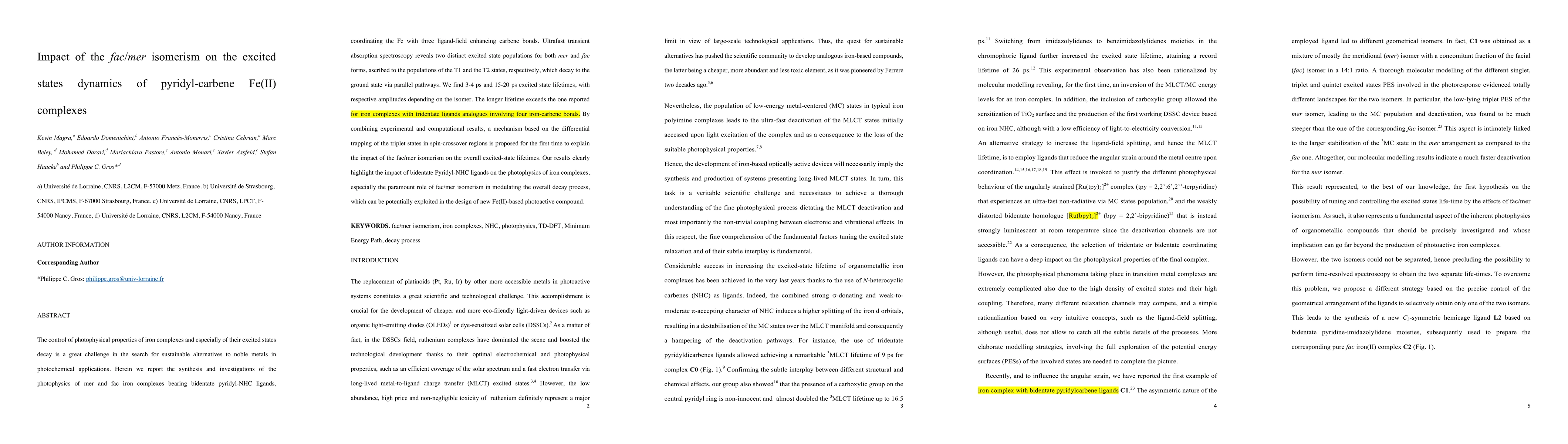 This research synthesizes and investigates Fe(II) complexes with pyridyl-NHC ligands, revealing distinct excited state populations for mer and fac isomers due to fac/mer isomerism. The study proposes a mechanism explaining how these isomers modulate excited-state decay, potentially aiding in designing new Fe(II)-based photoactive compounds.