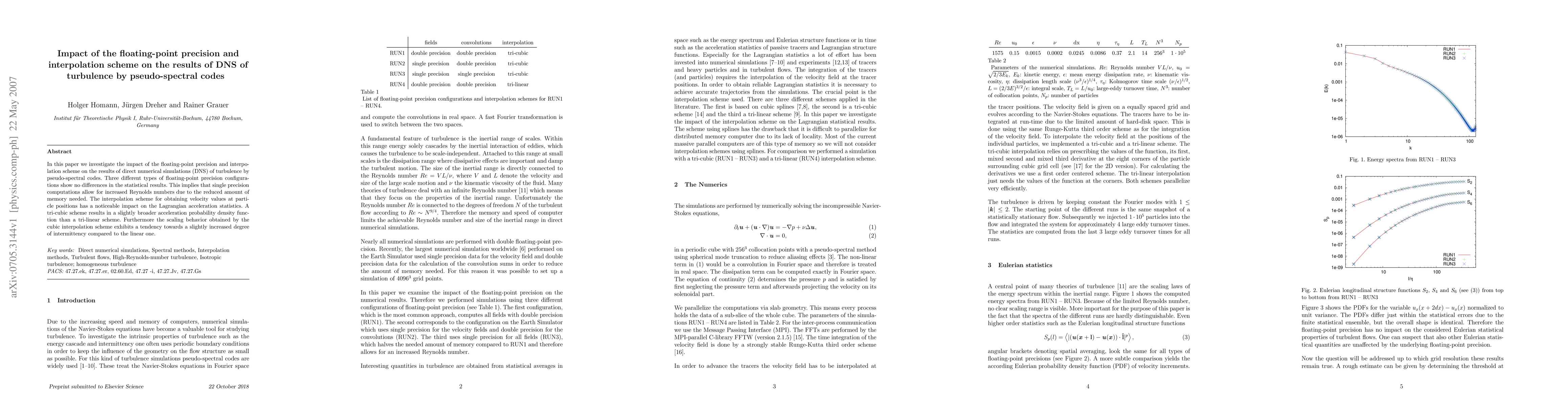 A study found that using single precision floating-point numbers in DNS simulations of turbulence has no effect on results, but interpolation schemes do impact Lagrangian acceleration statistics, with a cubic scheme showing slightly increased intermittency.
