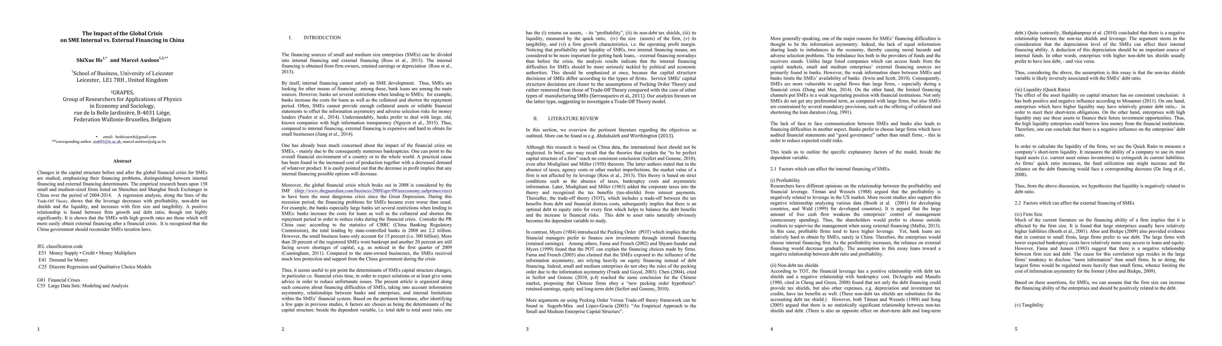 This study examines how the global financial crisis affected the capital structure of Chinese SMEs, distinguishing between internal and external financing. The research finds that leverage decreases with profitability and liquidity but increases with firm size and tangibility, while high-growth SMEs are more likely to secure external financing post-crisis. The study suggests that China's government should revise SMEs' taxation laws.