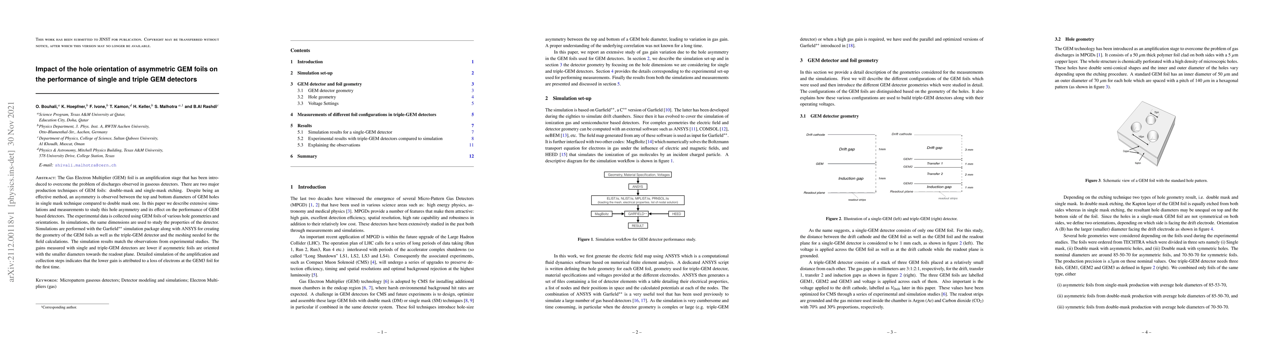 This paper investigates the impact of hole orientation in asymmetric GEM foils on the performance of single and triple GEM detectors, finding that lower gains occur when the smaller diameter of the asymmetric holes faces the readout plane, due to electron loss at the GEM3 foil. Simulation results using Garfield$^{++}$ and ANSYS match experimental observations.
