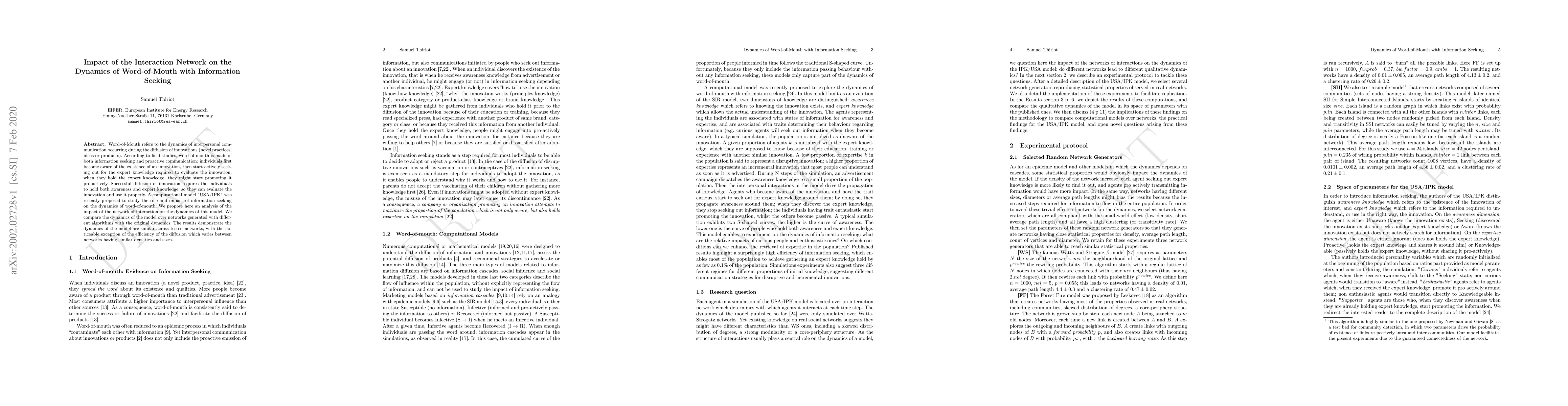 Word-of-Mouth refers to the dynamics of interpersonal communication occurring during the diffusion of innovations (novel practices, ideas or products). According to field studies, word-of-mouth is made of both information seeking and proactive communication: individuals first become aware of the existence of an innovation, then start actively seeking out for the expert knowledge required to evaluate the innovation; when they hold the expert knowledge, they might start promoting it pro-actively. Successful diffusion of innovation requires the individuals to hold both awareness and expert knowledge, so they can evaluate the innovation and use it properly. A computational model "USA/IPK" was recently proposed to study the role and impact of information seeking on the dynamics of word-of-mouth. We propose here an analysis of the impact of the network of interaction on the dynamics of this model. We compare the dynamics of the model over networks generated with different algorithms with the original dynamics. The results demonstrate the dynamics of the model are similar across tested networks, with the noticeable exception of the efficiency of the diffusion which varies between networks having similar densities and sizes.