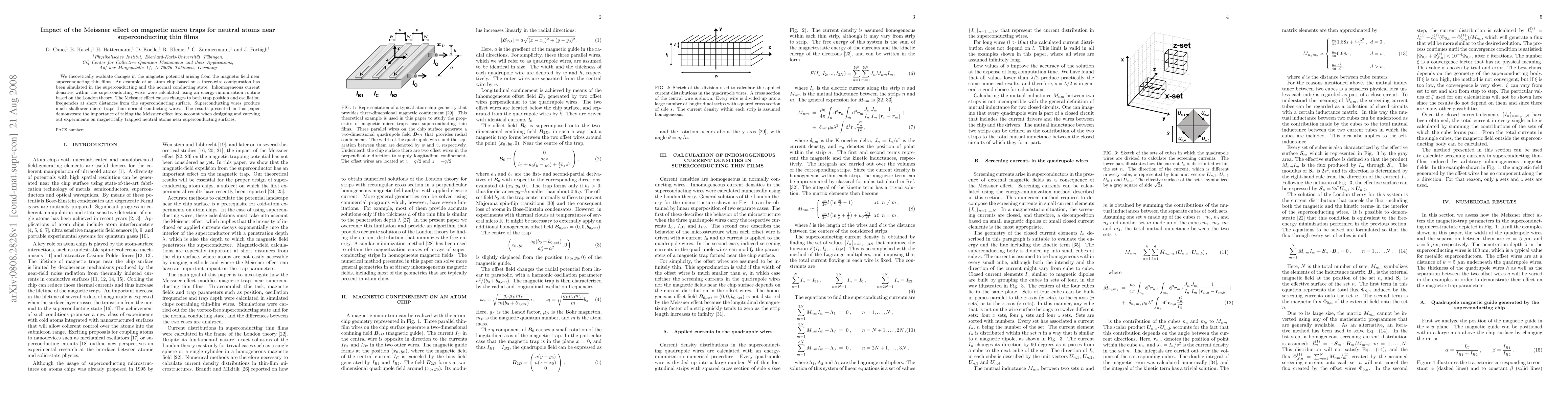 We theoretically evaluate changes in the magnetic potential arising from the magnetic field near superconducting thin films. An example of an atom chip based on a three-wire configuration has been simulated in the superconducting and the normal conducting state. Inhomogeneous current densities within the superconducting wires were calculated using an energy-minimization routine based on the London theory. The Meissner effect causes changes to both trap position and oscillation frequencies at short distances from the superconducting surface. Superconducting wires produce much shallower micro traps than normal conducting wires. The results presented in this paper demonstrate the importance of taking the Meissner effect into account when designing and carrying out experiments on magnetically trapped neutral atoms near superconducting surfaces.