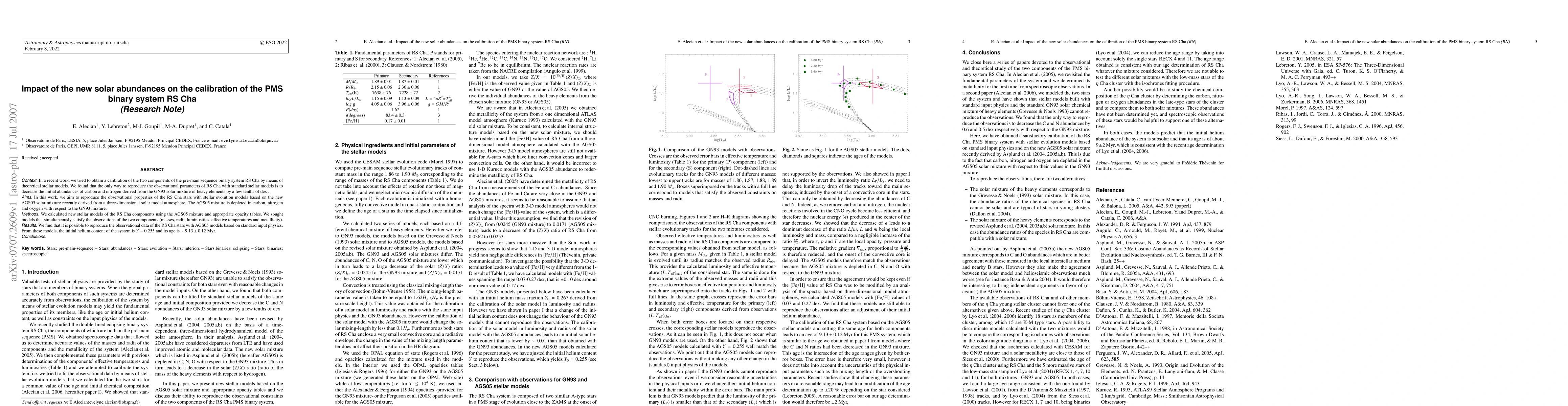This paper investigates the impact of new solar abundances on the calibration of the pre-main sequence binary system RS Cha, finding that the AGS05 solar mixture allows for accurate reproduction of the system's observational properties, yielding an initial helium content of Y~0.255 and an age of ~9.13 ± 0.12 Myr.