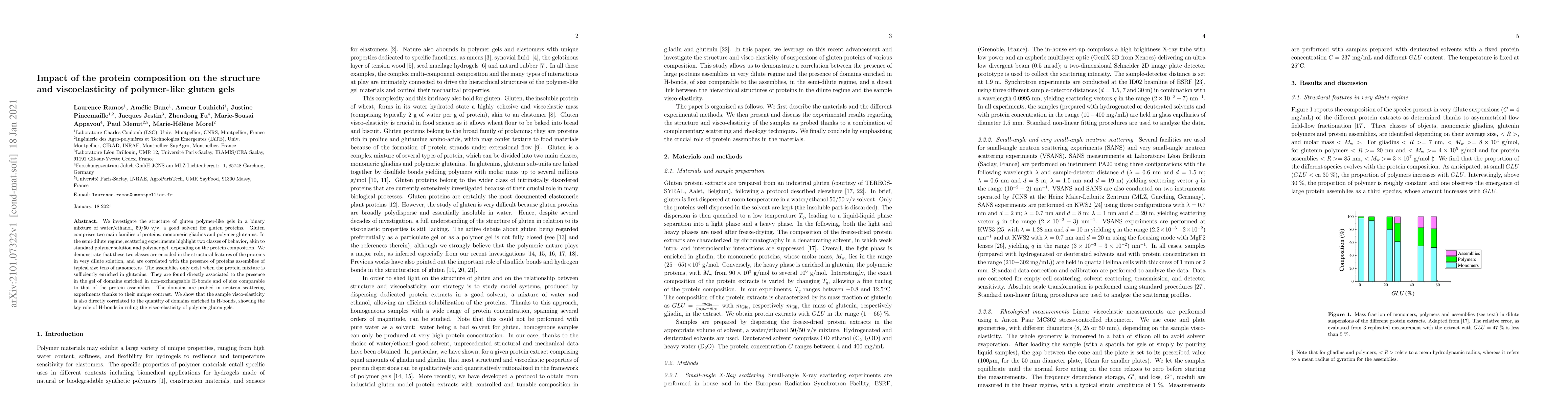 This study investigates the impact of gluten protein composition on the structure and viscoelasticity of gluten gels in a water/ethanol mixture. It reveals that the presence of specific protein assemblies, enriched in glutenins, correlates with the formation of domains with non-exchangeable hydrogen bonds, which in turn significantly influence the gel's viscoelastic properties.