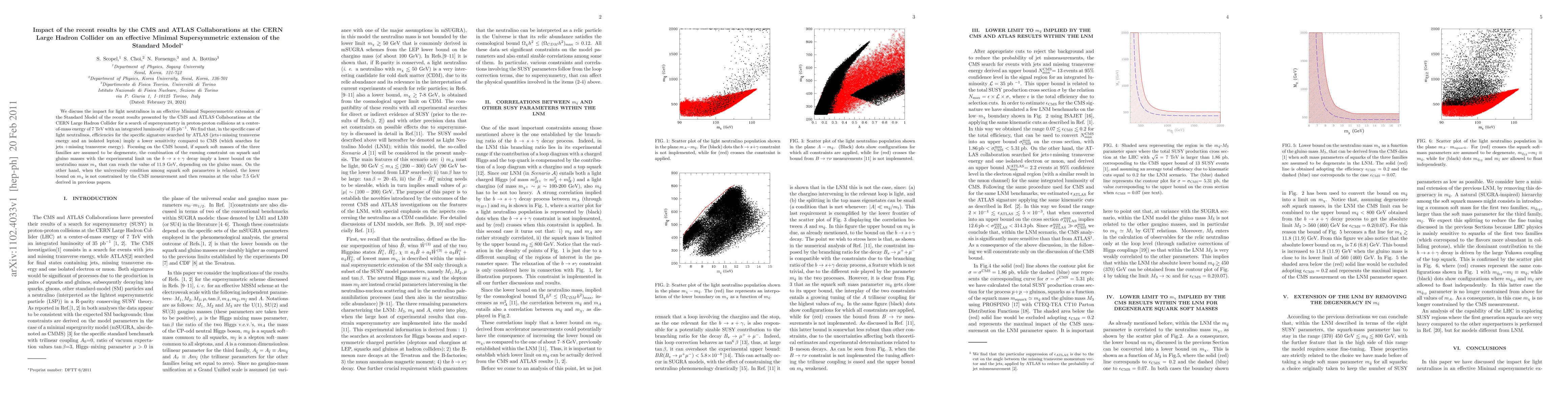We discuss the impact for light neutralinos in an effective Minimal Supersymmetric extension of the Standard Model of the recent results presented by the CMS and ATLAS Collaborations at the CERN Large Hadron Collider for a search of supersymmetry in proton-proton collisions at a center-of-mass energy of 7 TeV with an integrated luminosity of 35 inverse pb. We find that, in the specific case of light neutralinos, efficiencies for the specific signature searched by ATLAS (jets+missing transverse energy and an isolated lepton) imply a lower sensitivity compared to CMS (which searches for jets +missing transverse energy). Focusing on the CMS bound, if squark soft masses of the three families are assumed to be degenerate, the combination of the ensuing constraint on squark and gluino masses with the experimental limit on the b to s + gamma decay imply a lower bound on the neutralino mass that can reach the value of 11.9 GeV, depending on the gluino mass. On the other hand, when the universality condition among squark soft parameters is relaxed, the lower bound on the neutralino mass is not constrained by the CMS measurement and then remains at the value 7.5 GeV derived in previous papers.
