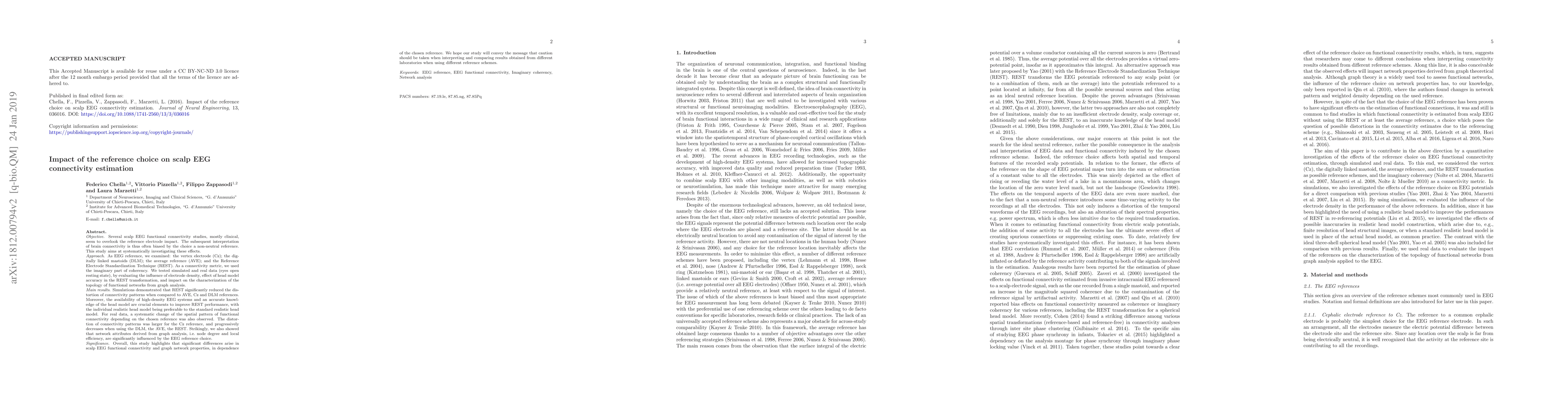 This study investigates how different EEG reference choices (Cz, DLM, AVE, REST) impact scalp EEG connectivity estimation, using the imaginary part of coherency as a connectivity metric. Results show that the Reference Electrode Standardization Technique (REST) significantly reduces connectivity pattern distortion compared to other references, especially with high-density EEG systems and accurate head models. The study emphasizes the importance of reference choice in interpreting EEG connectivity and graph network properties, urging caution in comparing results across different laboratories.