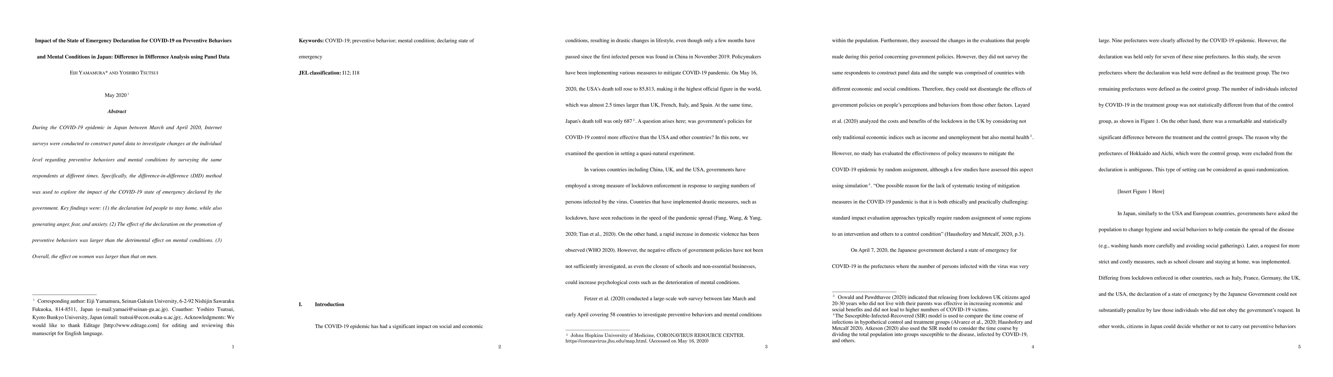 During the COVID-19 epidemic in Japan between March and April 2020, Internet surveys were conducted to construct panel data to investigate changes at the individual level regarding preventive behaviors and mental conditions by surveying the same respondents at different times. Specifically, the difference-in-difference (DID) method was used to explore the impact of the COVID-19 state of emergency declared by the government. Key findings were: (1) the declaration led people to stay home, while also generating anger, fear, and anxiety. (2) The effect of the declaration on the promotion of preventive behaviors was larger than the detrimental effect on mental conditions. (3) Overall, the effect on women was larger than that on men.