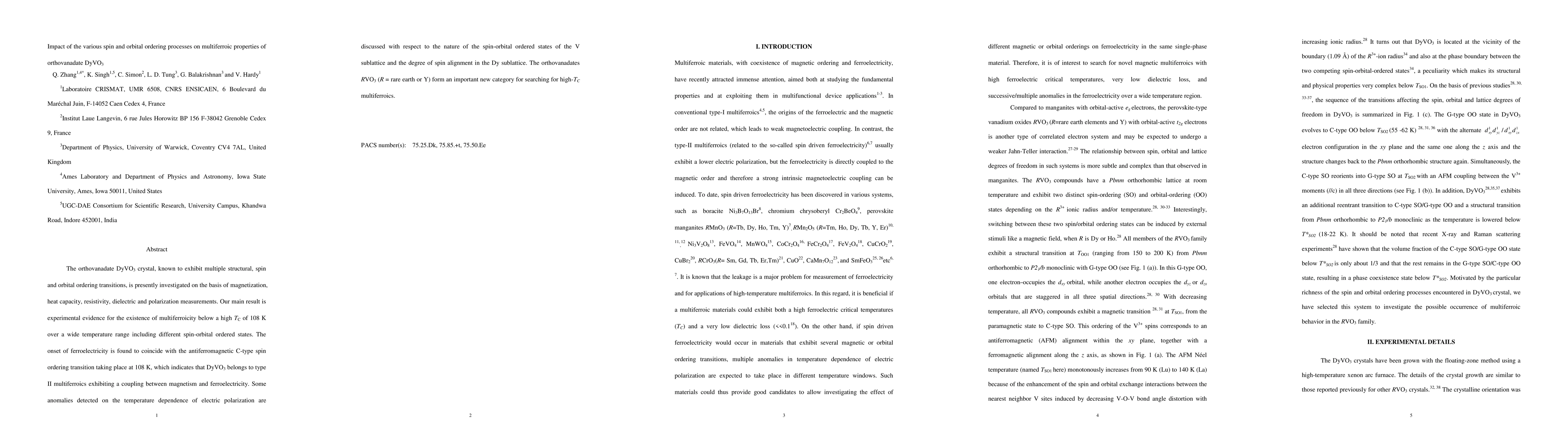 The orthovanadate DyVO3 crystal, known to exhibit multiple structural, spin and orbital ordering transitions, is presently investigated on the basis of magnetization, heat capacity, resistivity, dielectric and polarization measurements. Our main result is experimental evidence for the existence of multiferroicity below a high TC of 108 K over a wide temperature range including different spin-orbital ordered states. The onset of ferroelectricity is found to coincide with the antiferromagnetic C-type spin ordering transition taking place at 108 K, which indicates that DyVO3 belongs to type II multiferroics exhibiting a coupling between magnetism and ferroelectricity. Some anomalies detected on the temperature dependence of electric polarization are discussed with respect to the nature of the spin-orbital ordered states of the V sublattice and the degree of spin alignment in the Dy sublattice. The orthovanadates RVO3 (R = rare earth or Y) form an important new category for searching for high-TC multiferroics.