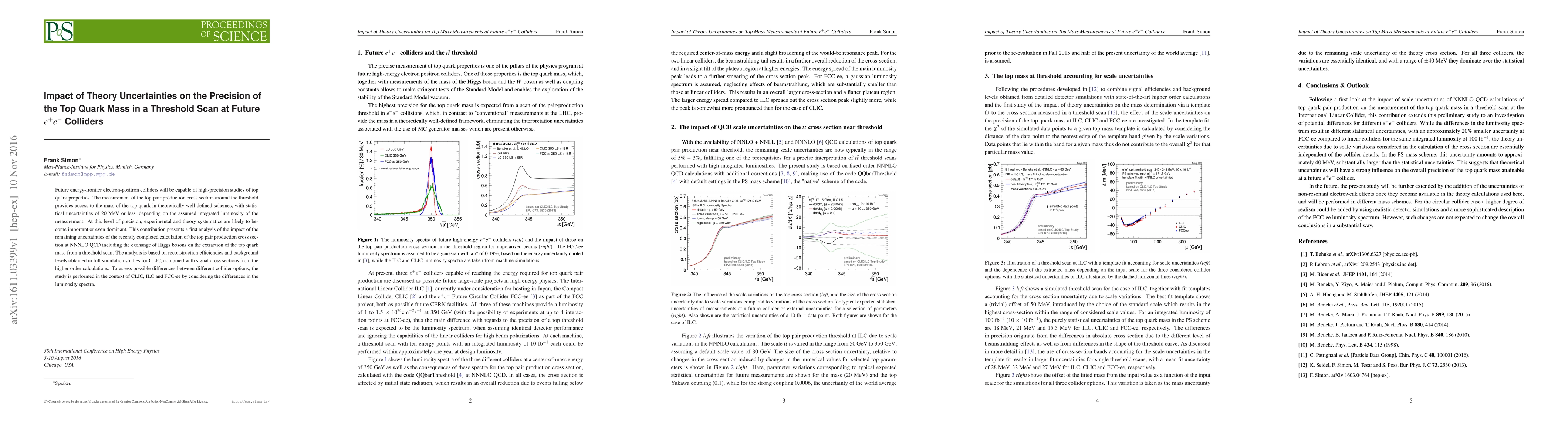 Future energy-frontier electron-positron colliders will be capable of high-precision studies of top quark properties. The measurement of the top-pair production cross section around the threshold provides access to the mass of the top quark in theoretically well-defined schemes, with statistical uncertainties of 20 MeV or less, depending on the assumed integrated luminosity of the measurement. At this level of precision, experimental and theory systematics are likely to become important or even dominant. This contribution presents a first analysis of the impact of the remaining uncertainties of the recently completed calculation of the top pair production cross section at NNNLO QCD including the exchange of Higgs bosons on the extraction of the top quark mass from a threshold scan. The analysis is based on reconstruction efficiencies and background levels obtained in full simulation studies for CLIC, combined with signal cross sections from the higher-order calculations. To assess possible differences between different collider options, the study is performed in the context of CLIC, ILC and FCC-ee by considering the differences in the luminosity spectra.