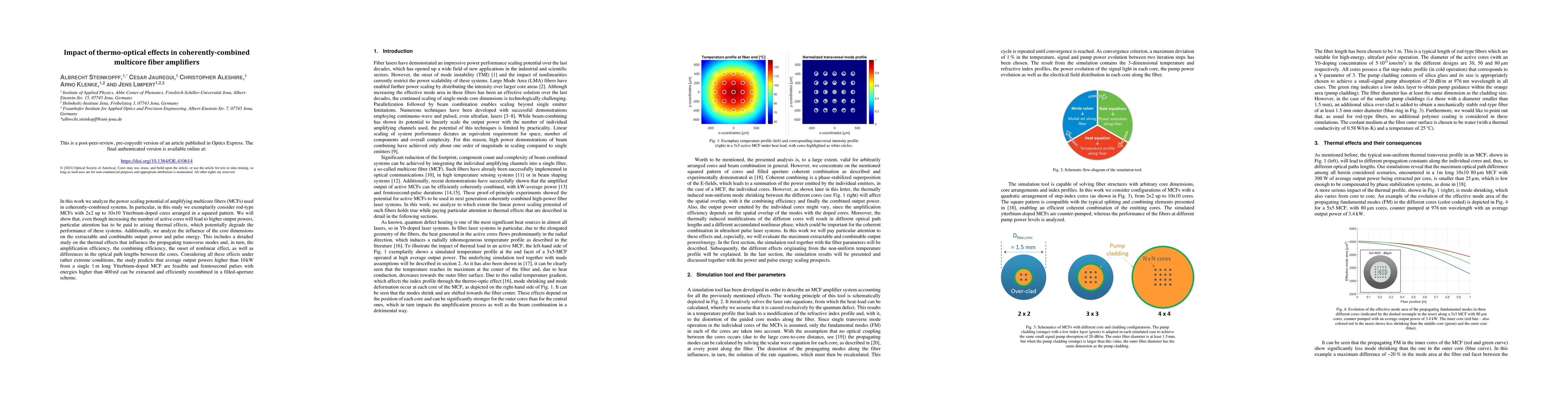 This research investigates the power scaling potential of amplifying multicore fibers (MCFs) in coherently-combined systems, focusing on the thermo-optical effects that can degrade performance. The study predicts that Ytterbium-doped MCFs can achieve average output powers exceeding 10 kW and femtosecond pulses with energies over 400 mJ, despite thermal effects impacting amplification and combining efficiency.