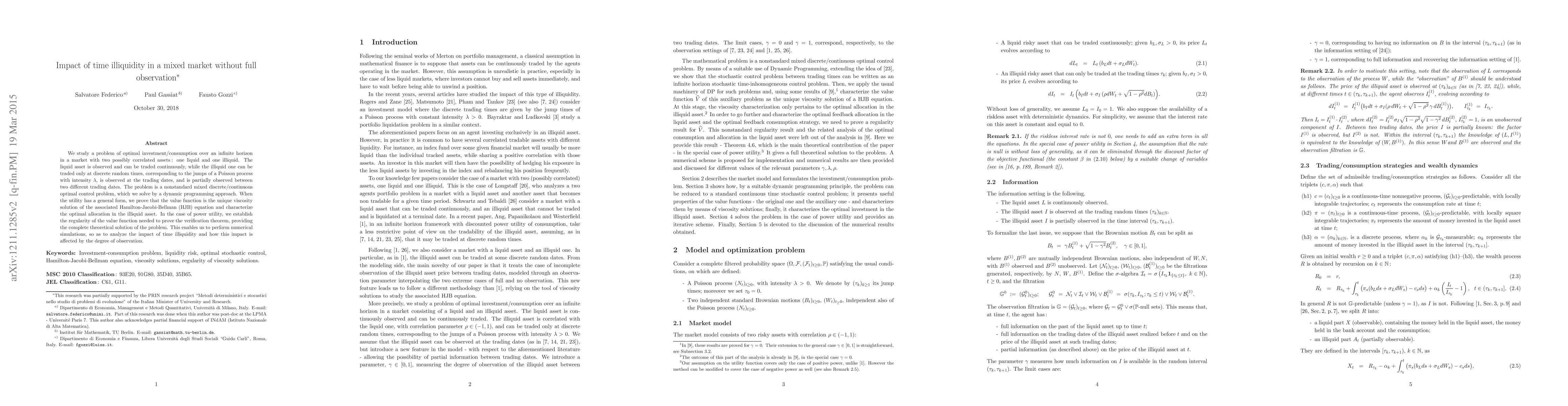 We study a problem of optimal investment/consumption over an infinite horizon in a market consisting of two possibly correlated assets: one liquid and one illiquid. The liquid asset is observed and can be traded continuously, while the illiquid one can be traded only at discrete random times corresponding to the jumps of a Poisson process with intensity $\lambda$, is observed at the trading dates, and is partially observed between two different trading dates. The problem is a nonstandard mixed discrete/continuous optimal control problem which we face by the dynamic programming approach. When the utility has a general form we prove that the value function is the unique viscosity solution of the HJB equation and, assuming sufficient regularity of the value function, we give a verification theorem that describes the optimal investment strategies for the illiquid asset. In the case of power utility, we prove the regularity of the value function needed to apply the verification theorem, providing the complete theoretical solution of the problem. This allows us to perform numerical simulation, so to analyze the impact of time illiquidity in this mixed market and how this impact is affected by the degree of observation.