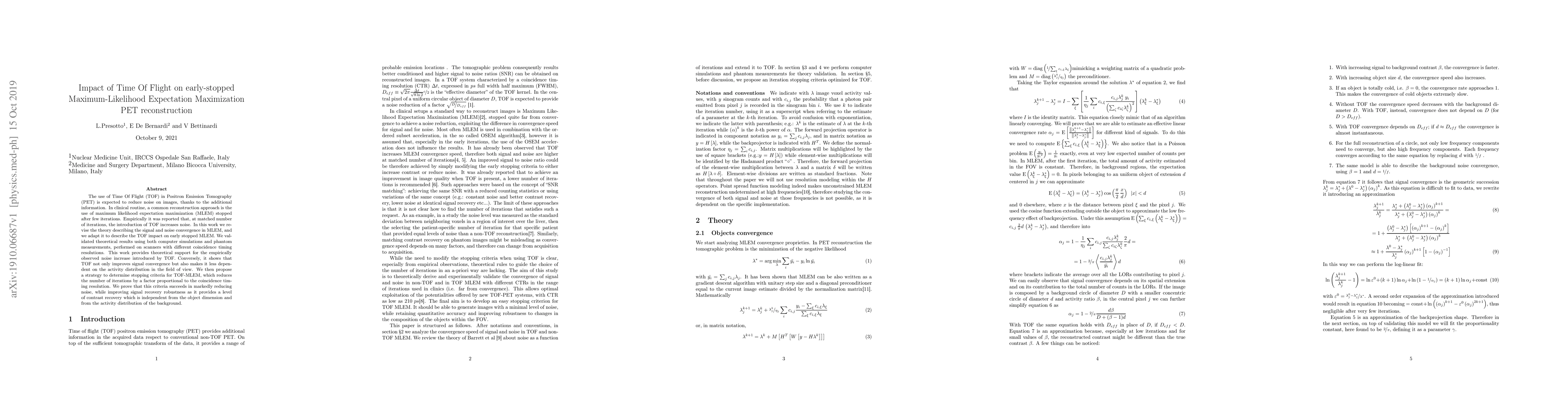 The use of Time Of Flight (TOF) in Positron Emission Tomography (PET) is expected to reduce noise on images, thanks to the additional information. In clinical routine, a common reconstruction approach is the use of maximum likelihood expectation maximization (MLEM) stopped after few iterations. Empirically it was reported that, at matched number of iterations, the introduction of TOF increases noise. In this work we revise the theory describing the signal and noise convergence in MLEM, and we adapt it to describe the TOF impact on early stopped MLEM. We validated theoretical results using both computer simulations and phantom measurements, performed on scanners with different coincidence timing resolutions. This work provides theoretical support for the empirically observed noise increase introduced by TOF. Conversely, it shows that TOF not only improves signal convergence but also makes it less dependent on the activity distribution in the field of view. We then propose a strategy to determine stopping criteria for TOF-MLEM, which reduces the number of iterations by a factor proportional to the coincidence timing resolution. We prove that this criteria succeeds in markedly reducing noise, while improving signal recovery robustness as it provides a level of contrast recovery which is independent from the object dimension and from the activity distribution of the background.
