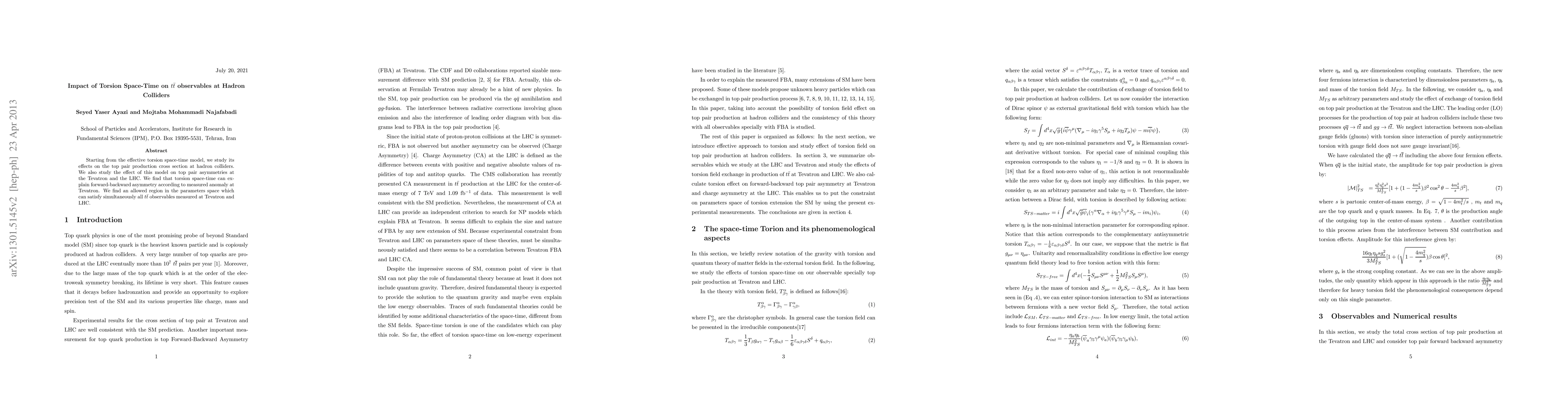 This paper investigates the influence of torsion space-time on top quark pair ($t\bar{t}$) production observables at hadron colliders, finding that it can explain the forward-backward asymmetry observed at the Tevatron and identifies a parameter region that aligns with all $t\bar{t}$ measurements from both the Tevatron and LHC.