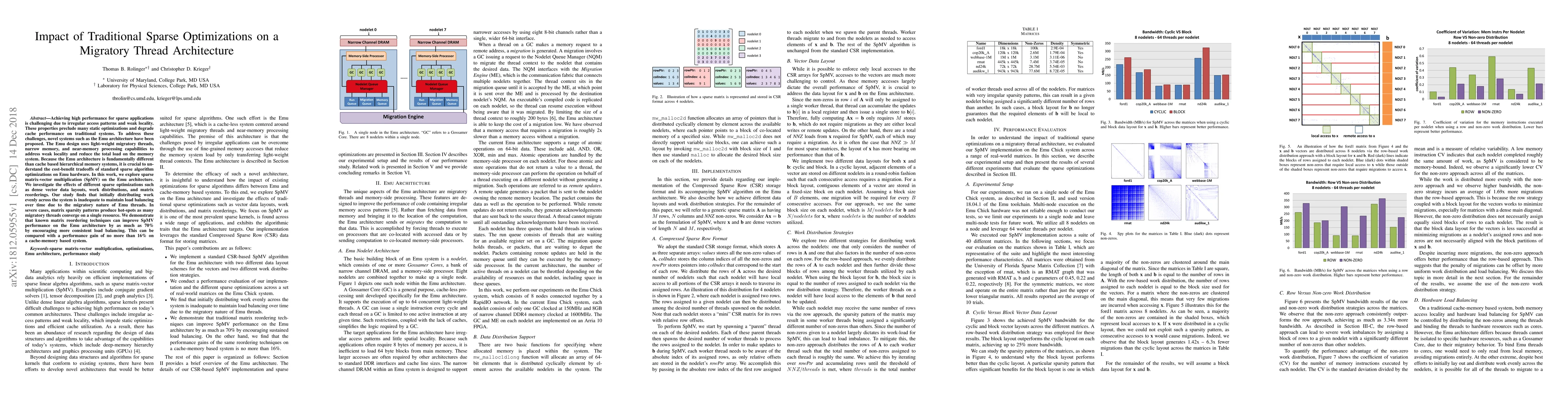 Achieving high performance for sparse applications is challenging due to irregular access patterns and weak locality. These properties preclude many static optimizations and degrade cache performance on traditional systems. To address these challenges, novel systems such as the Emu architecture have been proposed. The Emu design uses light-weight migratory threads, narrow memory, and near-memory processing capabilities to address weak locality and reduce the total load on the memory system. Because the Emu architecture is fundamentally different than cache based hierarchical memory systems, it is crucial to understand the cost-benefit tradeoffs of standard sparse algorithm optimizations on Emu hardware. In this work, we explore sparse matrix-vector multiplication (SpMV) on the Emu architecture. We investigate the effects of different sparse optimizations such as dense vector data layouts, work distributions, and matrix reorderings. Our study finds that initially distributing work evenly across the system is inadequate to maintain load balancing over time due to the migratory nature of Emu threads. In severe cases, matrix sparsity patterns produce hot-spots as many migratory threads converge on a single resource. We demonstrate that known matrix reordering techniques can improve SpMV performance on the Emu architecture by as much as 70% by encouraging more consistent load balancing. This can be compared with a performance gain of no more than 16% on a cache-memory based system.