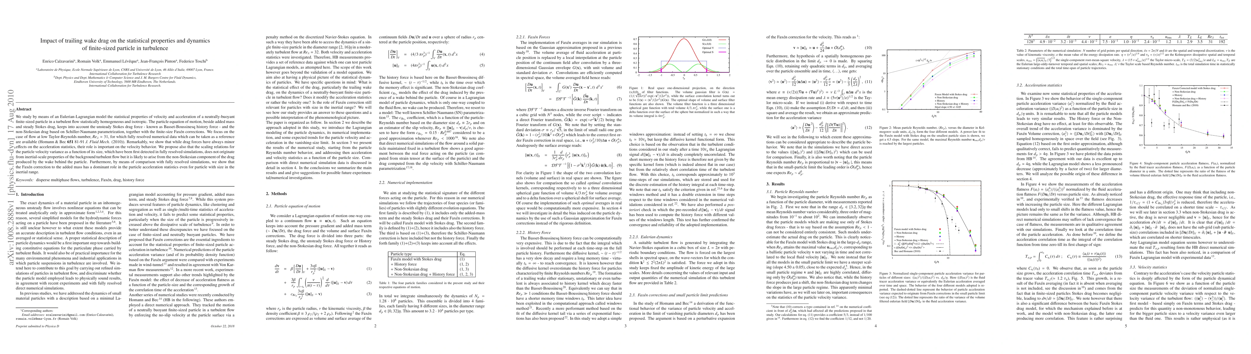 This research study investigates how trailing wake drag affects a neutrally-buoyant particle in turbulent flow, finding that drag forces have minor effects on acceleration but significant impacts on velocity behavior.