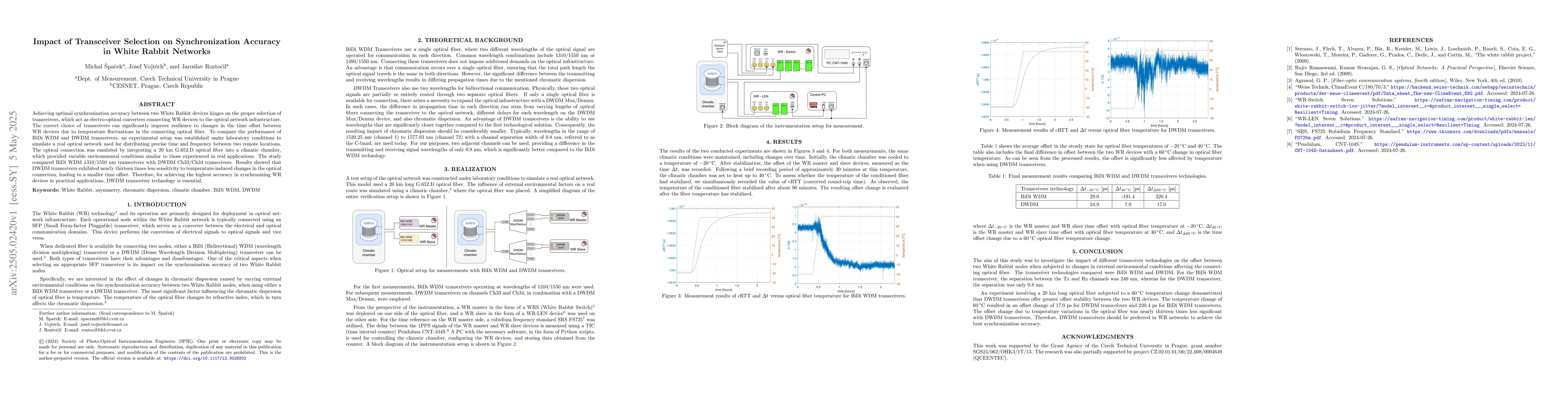This research uniquely compares BiDi WDM and DWDM transceivers in the context of White Rabbit networks, providing valuable insights for improving synchronization accuracy in practical applications.