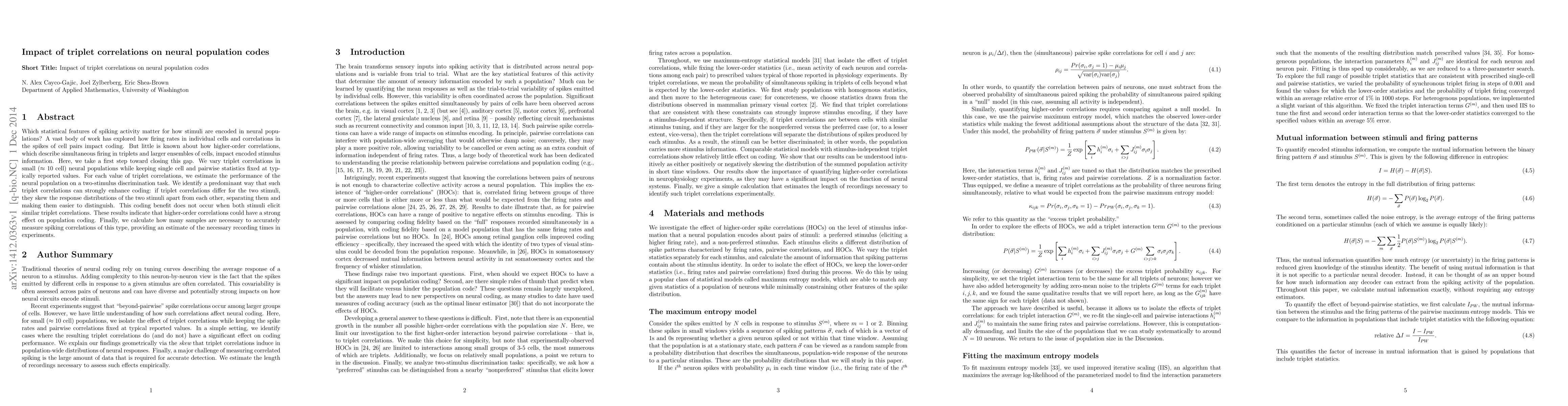 This research investigates the impact of triplet correlations in neural population codes, finding that distinct triplet correlations for different stimuli enhance coding by separating response distributions. The study manipulates triplet correlations in small neural populations, keeping single cell and pairwise statistics constant, to assess their effect on a two-stimulus discrimination task. The findings suggest higher-order correlations significantly influence population coding, and the paper also provides estimates for necessary recording times to accurately measure such correlations.