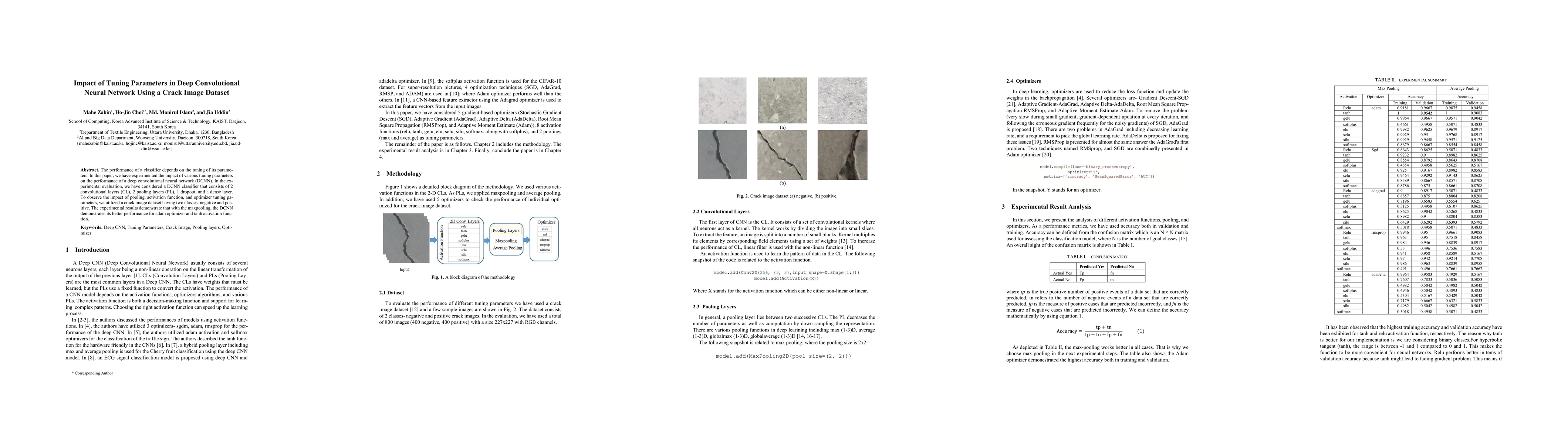 The research methodology involved experimenting with various tuning parameters of a deep convolutional neural network (DCNN) consisting of 2 convolutional layers, 2 pooling layers, 1 dropout, and a dense layer. A crack image dataset with negative and positive classes was used to observe the impact of pooling, activation function, and optimizer tuning parameters.