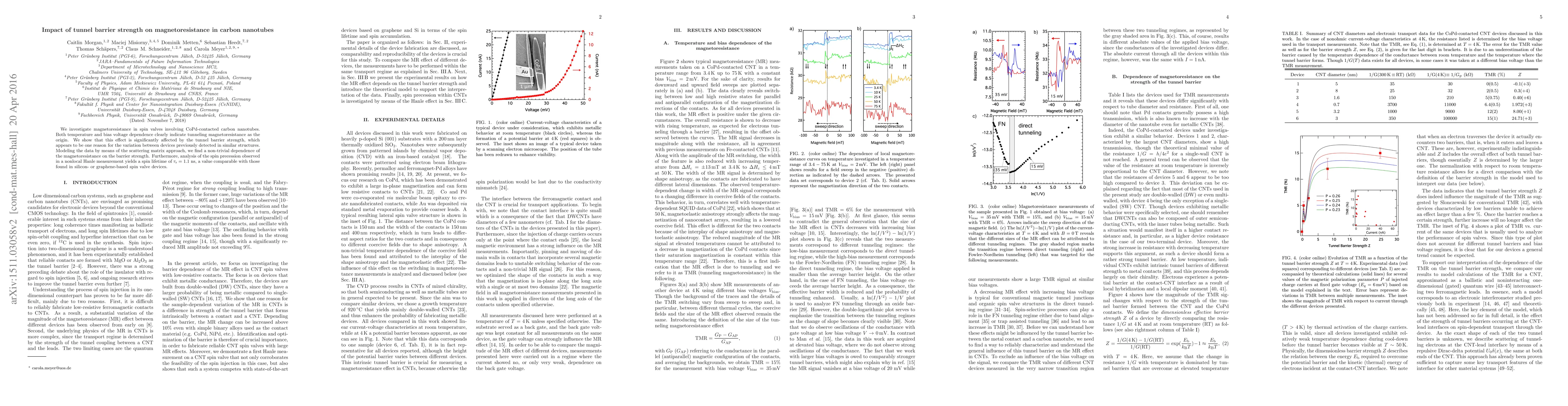 This study explores the magnetoresistance in CoPd-contacted carbon nanotube spin valves, attributing it to tunneling magnetoresistance. The research reveals that the tunnel barrier strength significantly influences this effect, explaining device-to-device variations, and employs a scattering matrix approach to model the non-trivial dependence on barrier strength.