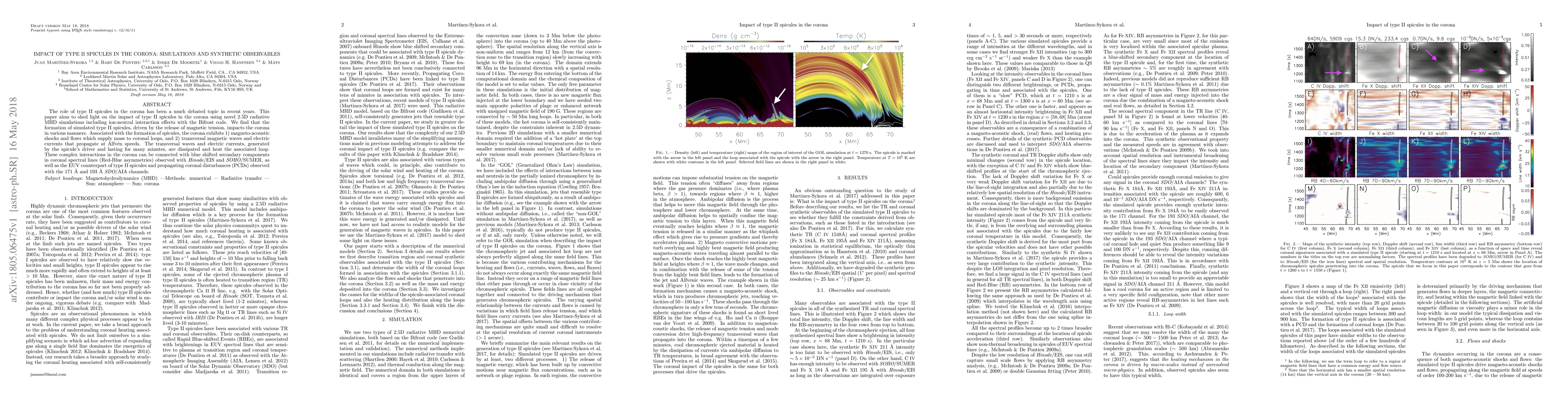 The role of type II spicules in the corona has been a much debated topic in recent years. This paper aims to shed light on the impact of type II spicules in the corona using novel 2.5D radiative MHD simulations including ion-neutral interaction effects with the Bifrost code. We find that the formation of simulated type II spicules, driven by the release of magnetic tension, impacts the corona in various manners. Associated with the formation of spicules, the corona exhibits 1) magneto-acoustic shocks and flows which supply mass to coronal loops, and 2) transversal magnetic waves and electric currents that propagate at Alfv\'en speeds. The transversal waves and electric currents, generated by the spicule's driver and lasting for many minutes, are dissipated and heat the associated loop. These complex interactions in the corona can be connected with blue shifted secondary components in coronal spectral lines (Red-Blue asymmetries) observed with Hinode/EIS and SOHO/SUMER, as well as the EUV counterpart of type II spicules and propagating coronal disturbances (PCDs) observed with the 171~\AA\ and 193~\AA\ SDO/AIA channels.