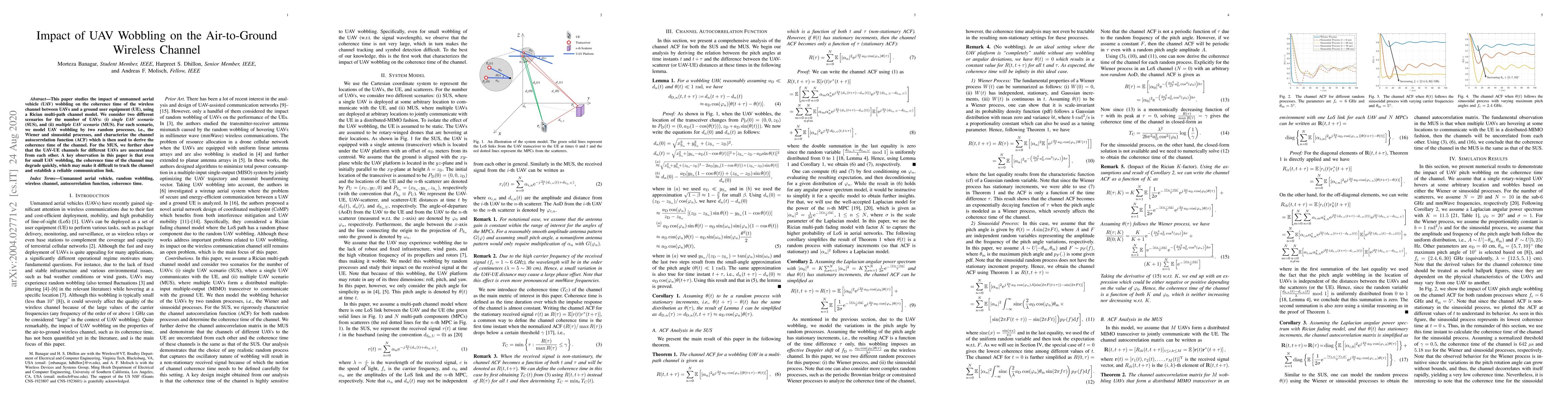 This paper investigates how UAV wobbling affects the coherence time of the air-to-ground wireless channel using a Rician multi-path model, finding that even minor wobbling can rapidly degrade channel coherence. It analyzes single and multiple UAV scenarios, showing that UAV-UE channels in multiple UAV scenarios are uncorrelated.