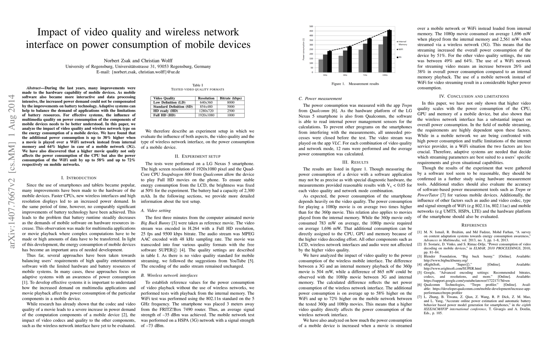 This paper investigates the influence of video quality and wireless network type on the power consumption of mobile devices. It finds that playing videos over WiFi or 3G networks increases power consumption by up to 38% and 64% respectively compared to internal memory, with higher video quality significantly raising CPU and WiFi/mobile network unit power usage by up to 58% and 72%.