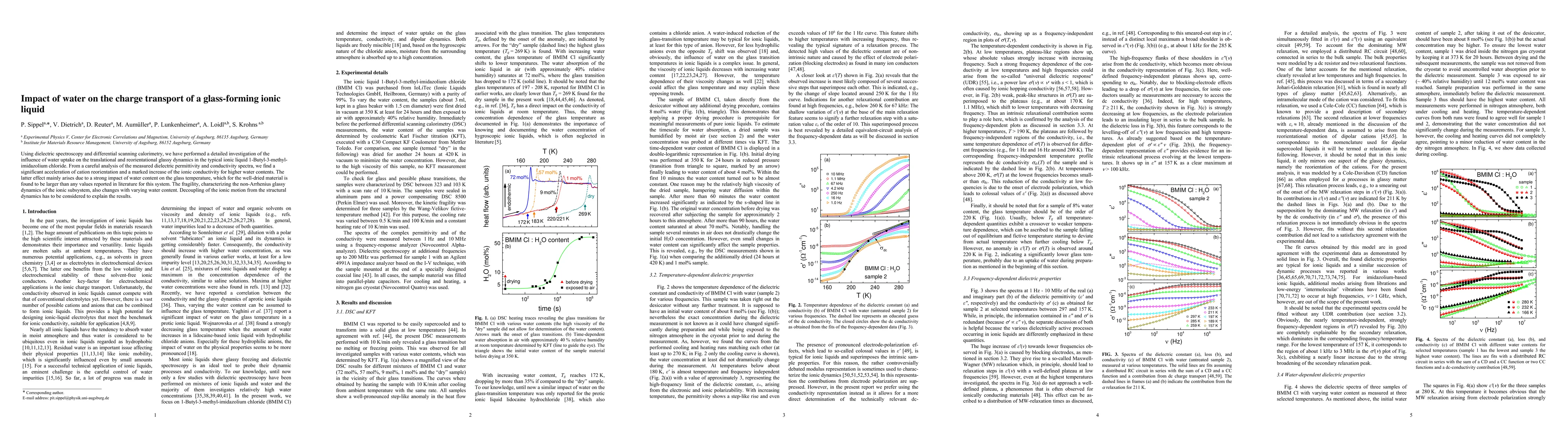 This study investigates the effect of water on the charge transport in the ionic liquid 1-Butyl-3-methyl-imidazolium chloride, revealing that higher water content significantly accelerates cation reorientation and increases ionic conductivity, primarily due to a substantial reduction in glass temperature. The findings suggest decoupling of ionic motion from structural dynamics.