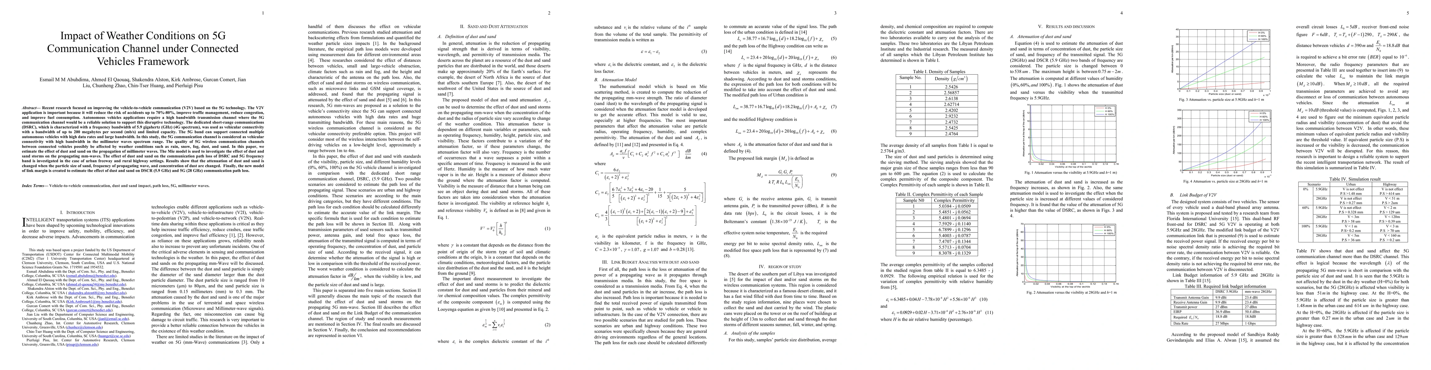 Recent research focused on improving the vehicle-to-vehicle communication (V2V) based on the 5G technology. The V2V application is important because it will reduce the risk of accidents up to 70%-80%, improve traffic management, reduce congestion, and improve fuel consumption. Autonomous vehicles applications require a high bandwidth transmission channel where the 5G communication channel would be a reliable solution to support this disruptive technology. The dedicated short-range communications (DSRC), which is characterized with a frequency bandwidth of 5.9 gigahertz (GHz) (4G spectrum), was used as vehicular connectivity with a bandwidth of up to 200 megabytes per second (mb/s) and limited capacity. The 5G band can support connected multiple autonomous vehicles with high data rates and large bandwidth. In this study, the 5G communication channel is considered as vehicular connectivity with high bandwidth in the millimeter waves spectrum range. The quality of 5G wireless communication channels between connected vehicles possibly be affected by weather conditions such as rain, snow, fog, dust, and sand. In this paper, we estimate the effect of dust and sand on the propagation of millimeter waves. The Mie model is used to investigate the effect of dust and sand storms on the propagating mm-waves. The effect of dust and sand on the communication path loss of DSRC and 5G frequency band is investigated in the case of urban freeway and rural highway settings. Results show that the attenuation of dust and sand is changed when the particle size of sand, frequency of propagating wave, and concentration of dust are changed. Finally, the new model of link margin is created to estimate the effect of dust and sand on DSCR (5.9 GHz) and 5G (28 GHz) communication path loss.