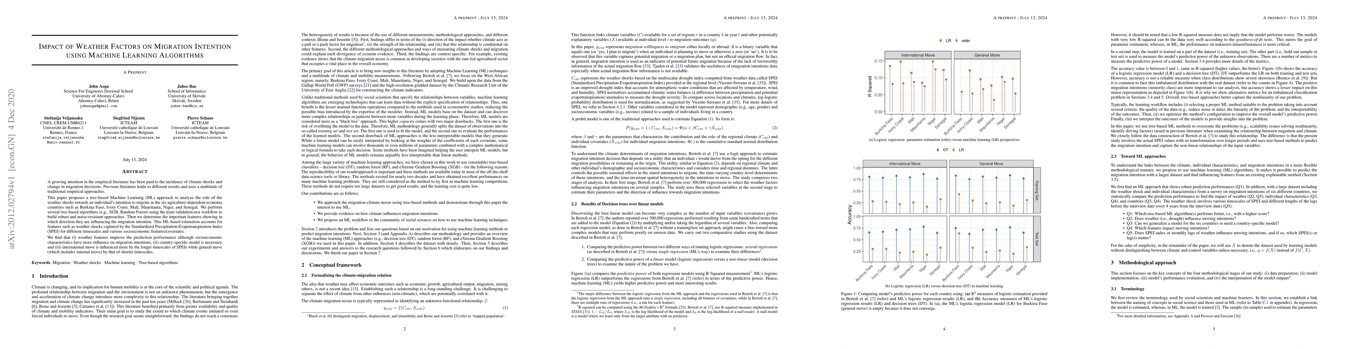 This paper employs tree-based Machine Learning algorithms to analyze how weather shocks affect migration intentions in six agriculture-dependent countries. The study finds that while weather features enhance prediction, socioeconomic factors have a greater influence, and longer timescales of weather indices impact international migration more than shorter ones.