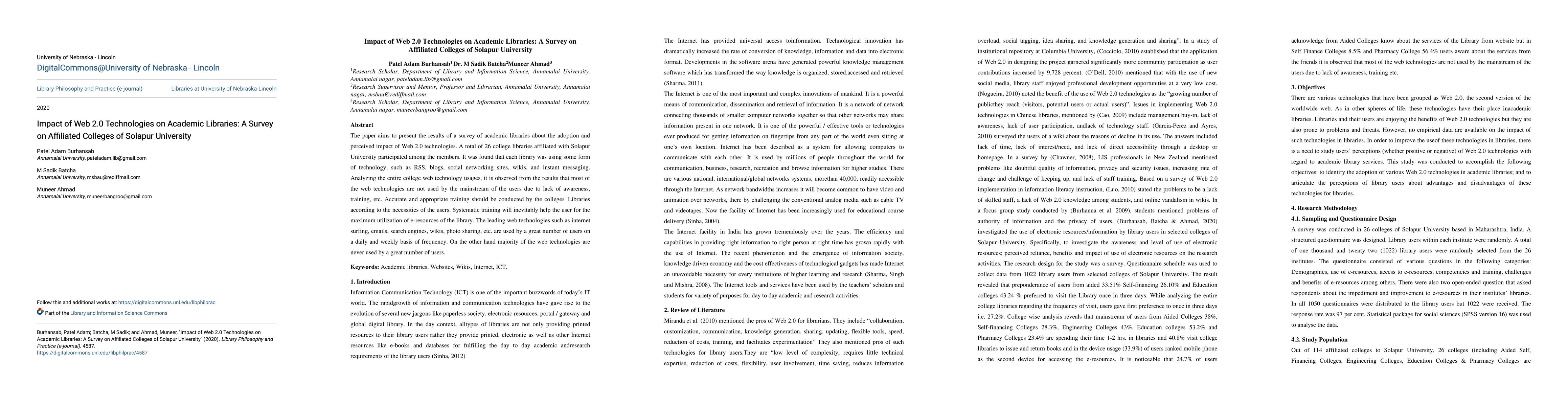 This study surveys 26 college libraries affiliated with Solapur University on the adoption of Web 2.0 technologies, finding that while some technologies like blogs and wikis are used, many remain underutilized due to lack of awareness and training. Effective training is essential for maximizing the use of e-resources.
