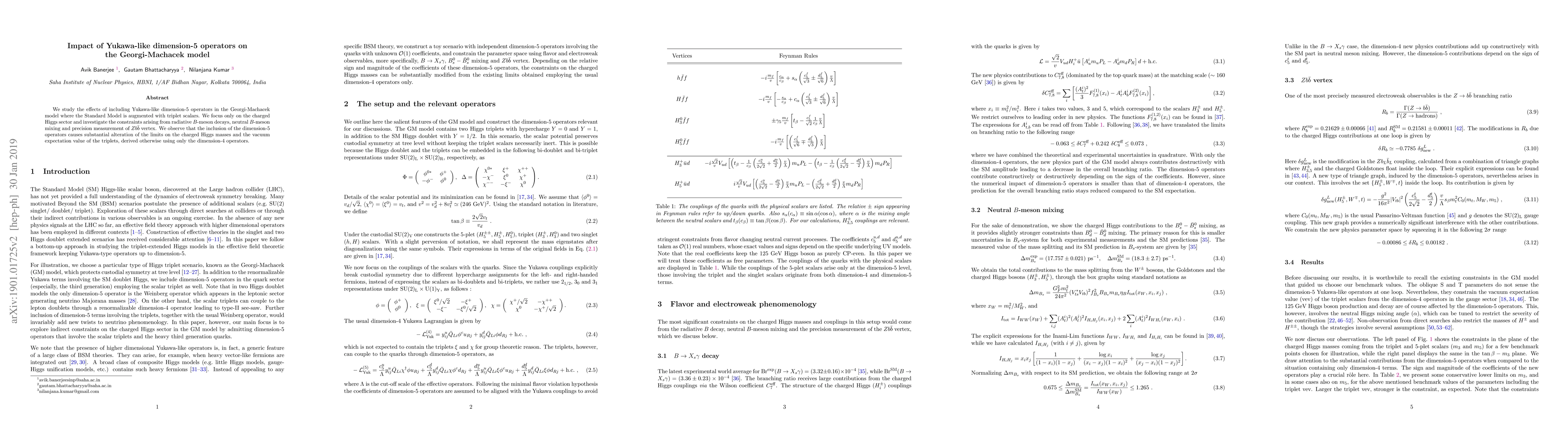 This paper examines the influence of Yukawa-like dimension-5 operators in the Georgi-Machacek model, which extends the Standard Model with triplet scalars. It finds that these operators significantly alter constraints on charged Higgs masses and the vacuum expectation value of triplets, particularly affecting results from radiative B-meson decays, neutral B-meson mixing, and Zbb vertex measurements.