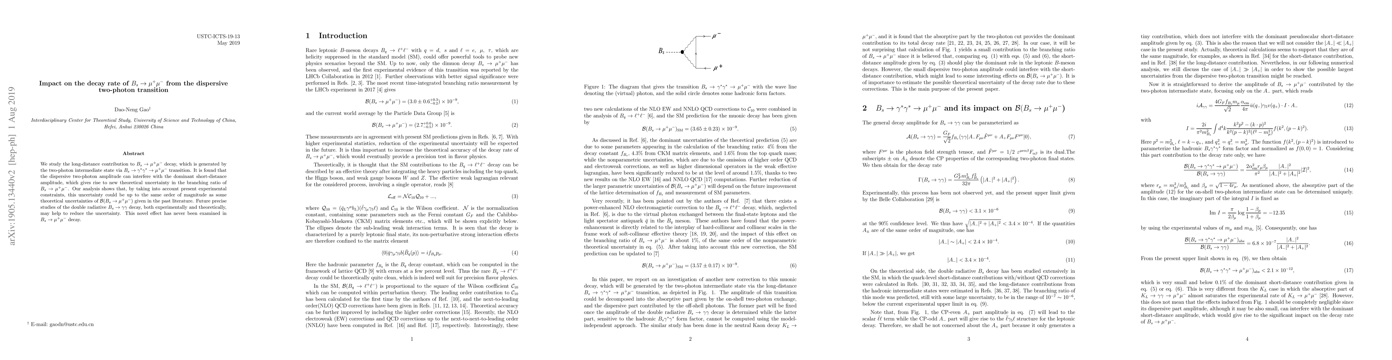 This paper investigates the long-distance contribution to $B_s\to\mu^+\mu^-$ decay via a dispersive two-photon intermediate state, revealing that it can interfere with the dominant short-distance amplitude, introducing new theoretical uncertainty in the branching ratio. Future precise studies on $B_s\to\gamma\gamma$ decay may help mitigate this uncertainty.