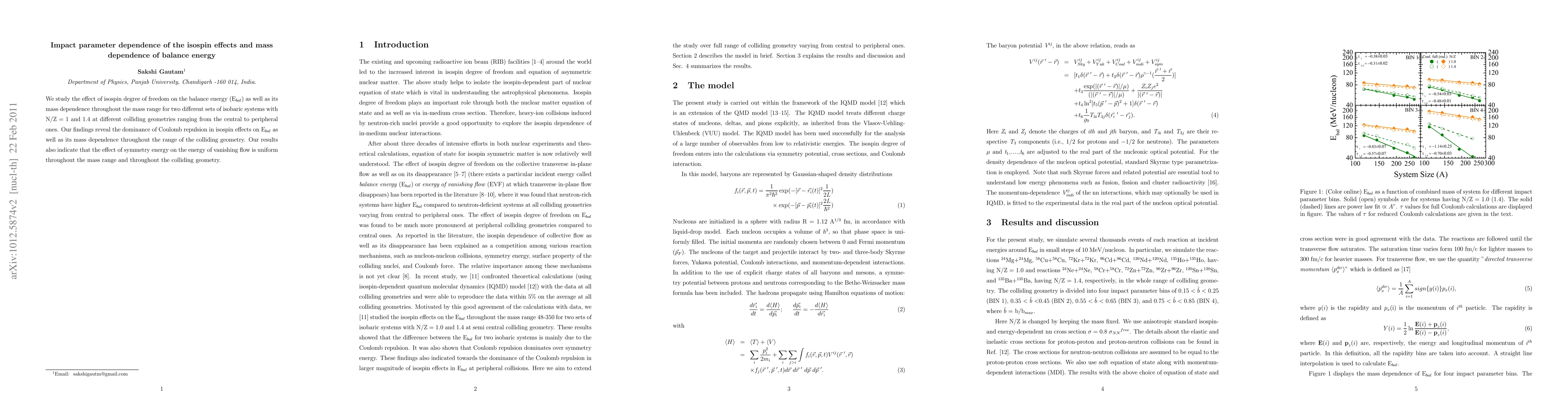 This study investigates the influence of isospin on balance energy (E$_{bal}$) and its mass dependence across various colliding geometries. Results show that Coulomb repulsion significantly affects E$_{bal}$ and its mass dependence, while symmetry energy's impact on vanishing flow remains consistent across the mass range and geometries.