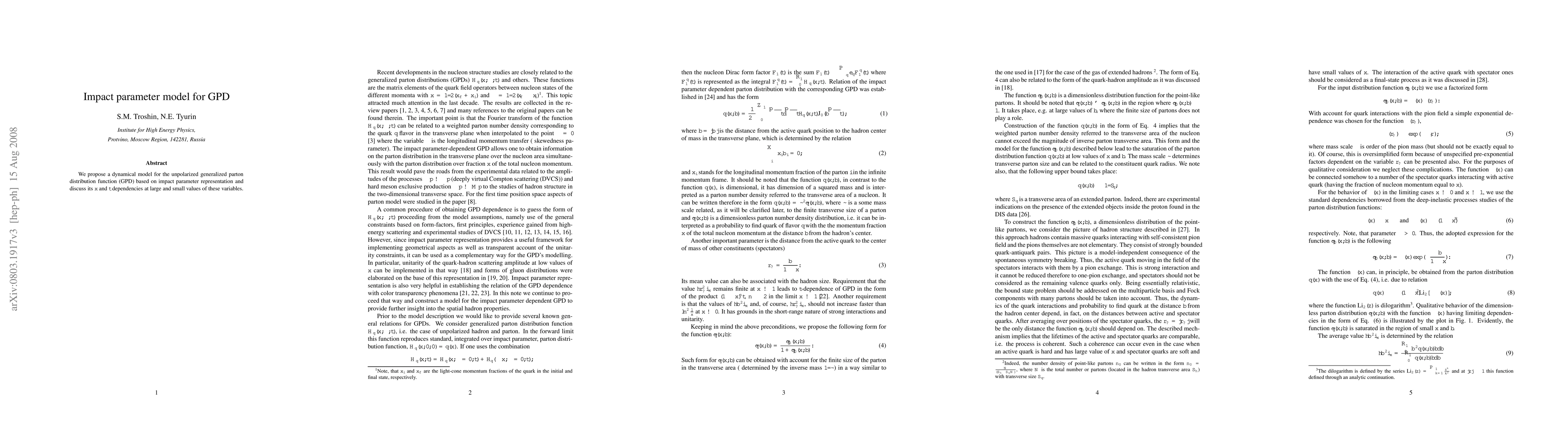 This paper proposes a new model for the unpolarized generalized parton distribution function (GPD) using an impact parameter representation, and analyzes its behavior concerning x and t dependencies across large and small values of these variables.