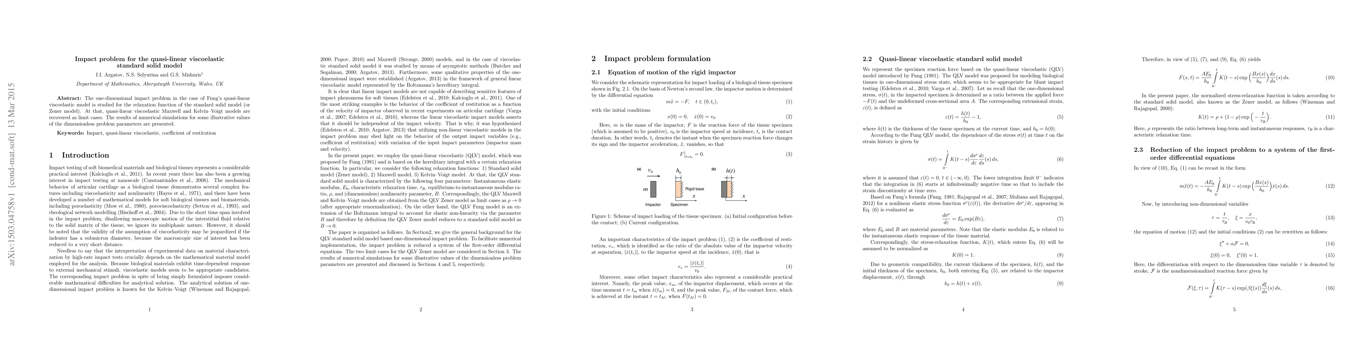 This paper investigates the one-dimensional impact problem within Fung's quasi-linear viscoelastic model, focusing on the relaxation function of the standard solid model. It also demonstrates how the quasi-linear viscoelastic Maxwell and Kelvin-Voigt models emerge as limiting cases, supported by numerical simulations for specific parameter values.