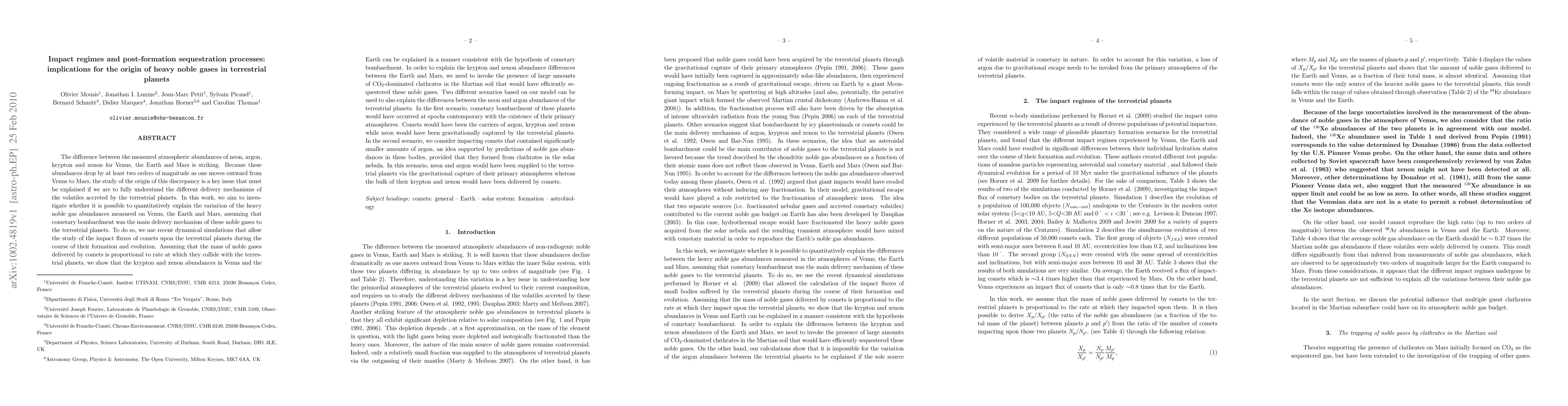 This paper investigates the varying abundances of heavy noble gases on Venus, Earth, and Mars, suggesting cometary bombardment as the primary delivery mechanism. The study finds that while cometary impacts can explain the abundances of krypton and xenon on Venus and Earth, the lower abundances on Mars require the presence of CO2-dominated clathrates that sequestered these gases.