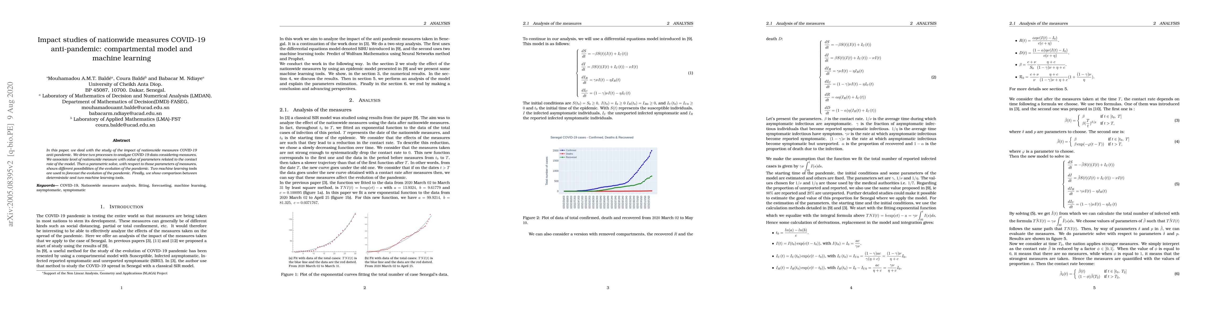 In this paper, we deal with the study of the impact of nationwide measures COVID-19 anti-pandemic. We drive two processes to analyze COVID-19 data considering measures. We associate level of nationwide measure with value of parameters related to the contact rate of the model. Then a parametric solve, with respect to those parameters of measures, shows different possibilities of the evolution of the pandemic. Two machine learning tools are used to forecast the evolution of the pandemic. Finally, we show comparison between deterministic and two machine learning tools.