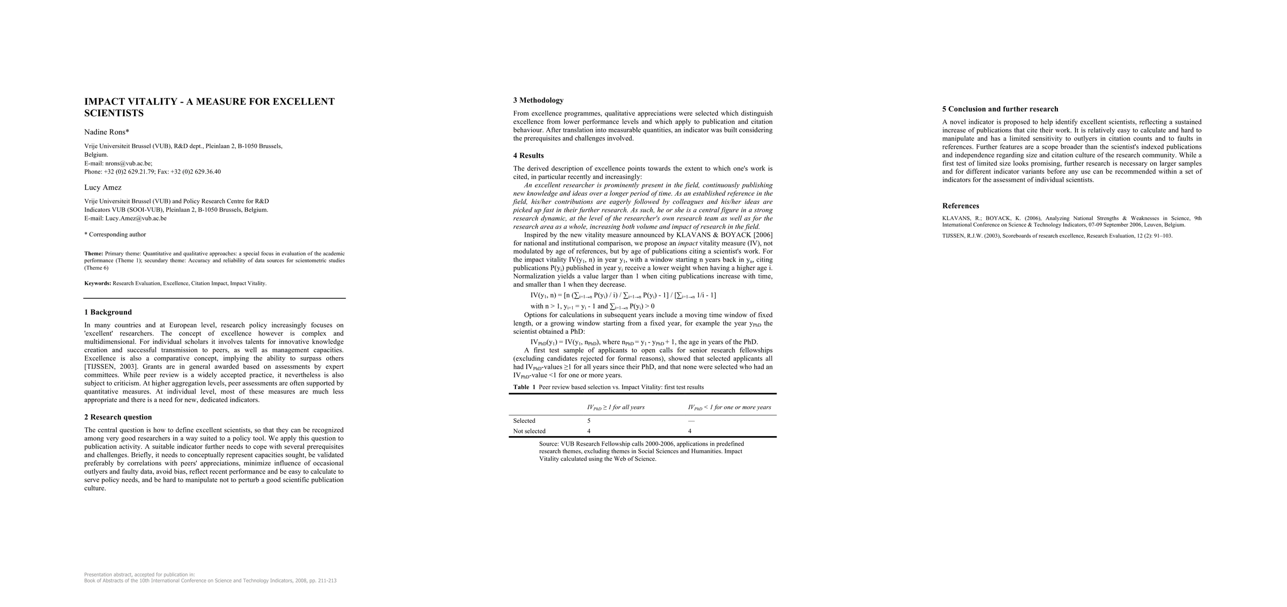 In many countries and at European level, research policy increasingly focuses on 'excellent' researchers. The concept of excellence however is complex and multidimensional. For individual scholars it involves talents for innovative knowledge creation and successful transmission to peers, as well as management capacities. Excellence is also a comparative concept, implying the ability to surpass others [TIJSSEN, 2003]. Grants are in general awarded based on assessments by expert committees. While peer review is a widely accepted practice, it nevertheless is also subject to criticism. At higher aggregation levels, peer assessments are often supported by quantitative measures. At individual level, most of these measures are much less appropriate and there is a need for new, dedicated indicators.