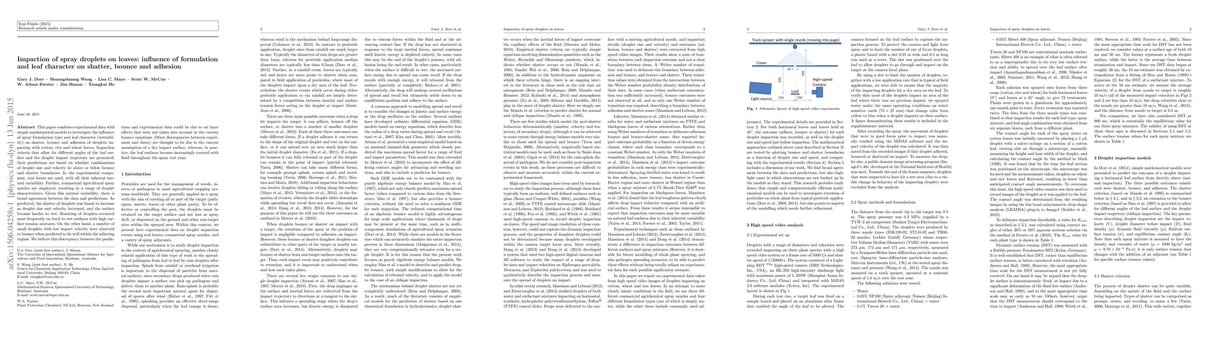 This study combines experimental data with mathematical models to explore how spray formulation and leaf wettability affect droplet shatter, bounce, and adhesion on cotton, rice, and wheat leaves. Results show that shatter increases with droplet size and velocity, while bounce is more common on surfaces with high surface tension and low wettability.
