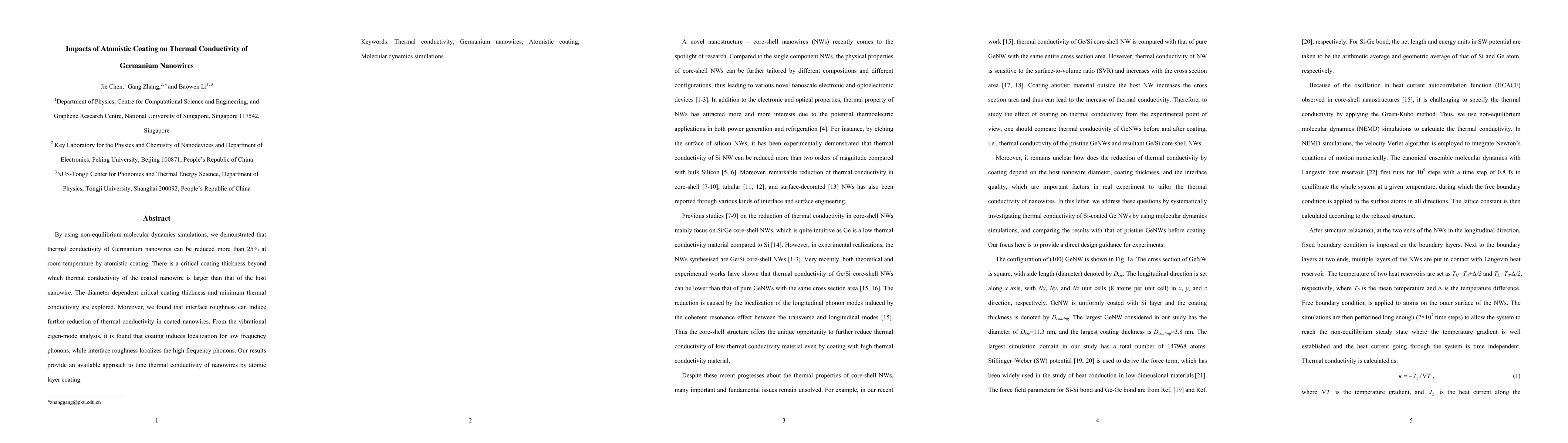 Summary: This study uses molecular dynamics simulations to show that atomistic coating can reduce the thermal conductivity of Germanium nanowires by over 25% at room temperature, with a critical coating thickness influencing the extent of this reduction. Interface roughness further diminishes thermal conductivity by localizing phonons, offering a method to control nanowire thermal properties.