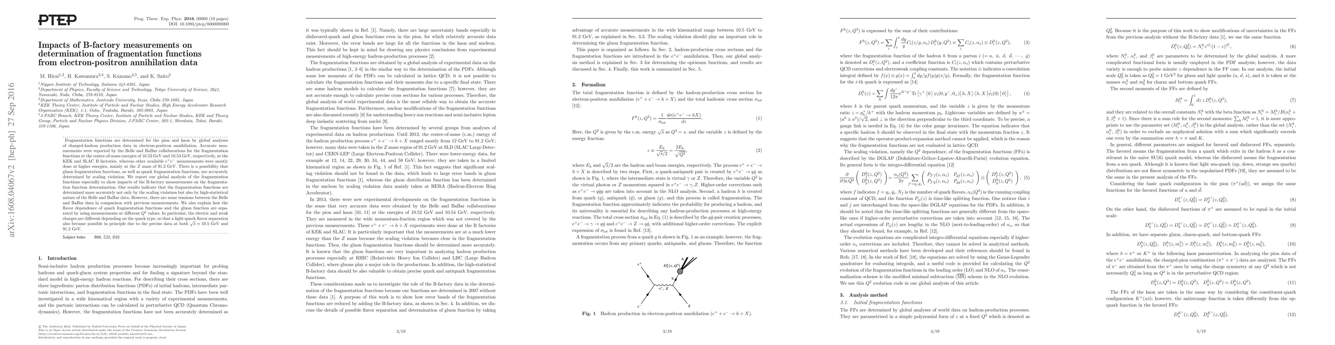 Fragmentation functions are determined for the pion and kaon by global analyses of charged-hadron production data in electron-positron annihilation. Accurate measurements were reported by the Belle and BaBar collaborations for the fragmentation functions at the center-of-mass energies of 10.52 GeV and 10.54 GeV, respectively, at the KEK and SLAC B factories, whereas other available $e^+e^-$ measurements were mostly done at higher energies, mainly at the $Z$ mass of 91.2 GeV. There is a possibility that gluon fragmentation functions, as well as quark fragmentation functions, are accurately determined by scaling violation. We report our global analysis of the fragmentation functions especially to show impacts of the B-factory measurements on the fragmentation function determination. Our results indicate that the fragmentation functions are determined more accurately not only by the scaling violation but also by high-statistical nature of the Belle and BaBar data. However, there are some tensions between the Belle and BaBar data in comparison with previous measurements. We also explain how the flavor dependence of quark fragmentation functions and the gluon function are separated by using measurements at different $Q^2$ values. In particular, the electric and weak changes are different depending on the quark type, so that a light-quark flavor separation also became possible in principle due to the precise data at both $\sqrt{s}\simeq 10.5$ GeV and 91.2 GeV.