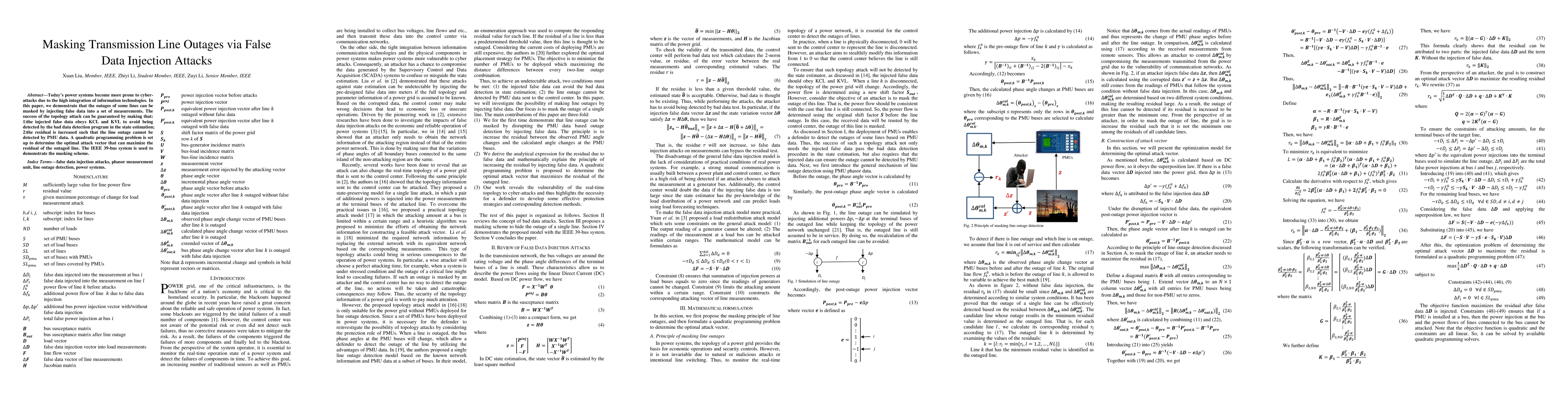This paper investigates how false data injection can mask line outages in power systems using Phasor Measurement Units (PMUs). It demonstrates that strategically crafted bad data, adhering to Kirchhoff's laws and increasing residual, can evade detection and hide line outages, using a quadratic programming approach on the IEEE 39-bus system.