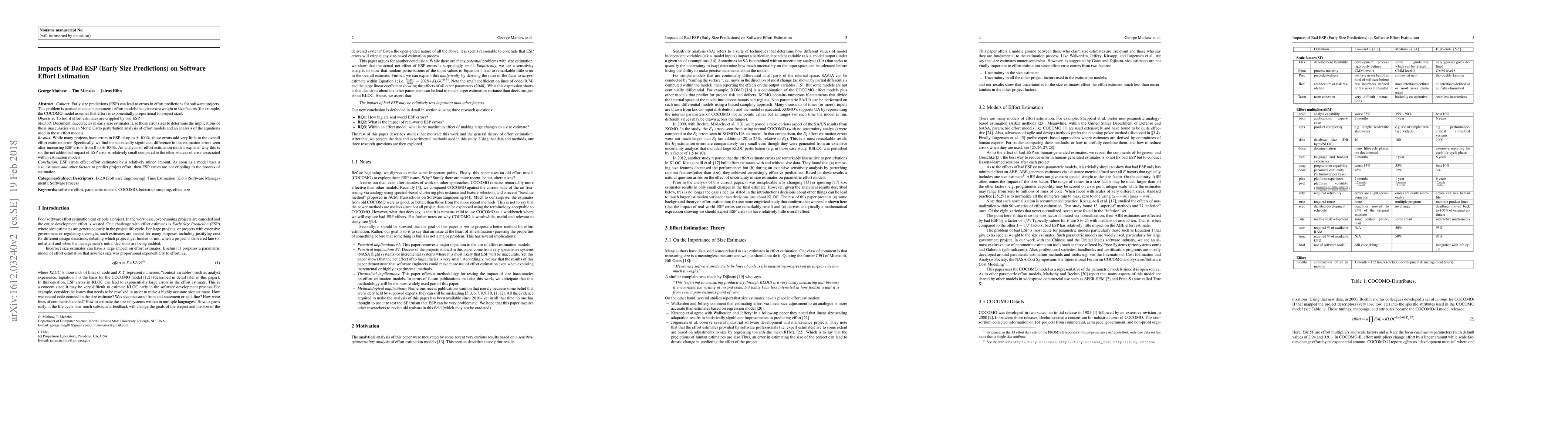 Context: Early size predictions (ESP) can lead to errors in effort predictions for software projects. This problem is particular acute in parametric effort models that give extra weight to size factors (for example, the COCOMO model assumes that effort is exponentially proportional to project size). Objective: To test if effort estimates are crippled by bad ESP. Method: Document inaccuracies in early size estimates. Use those error sizes to determine the implications of those inaccuracies via a Monte Carlo perturbation analysis of effort models and an analysis of the equations used in those effort models. Results: While many projects have errors in ESP of up to +/- 100%, those errors add very little to the overall effort estimate error. Specifically, we find no statistically significant difference in the estimation errors seen after increasing ESP errors from 0 to +/- 100%. An analysis of effort estimation models explains why this is so: the net additional impact of ESP error is relatively small compared to the other sources of error associated with in estimation models. Conclusion: ESP errors effect effort estimates by a relatively minor amount. As soon as a model uses a size estimate and other factors to predict project effort, then ESP errors are not crippling to the process of estimation
