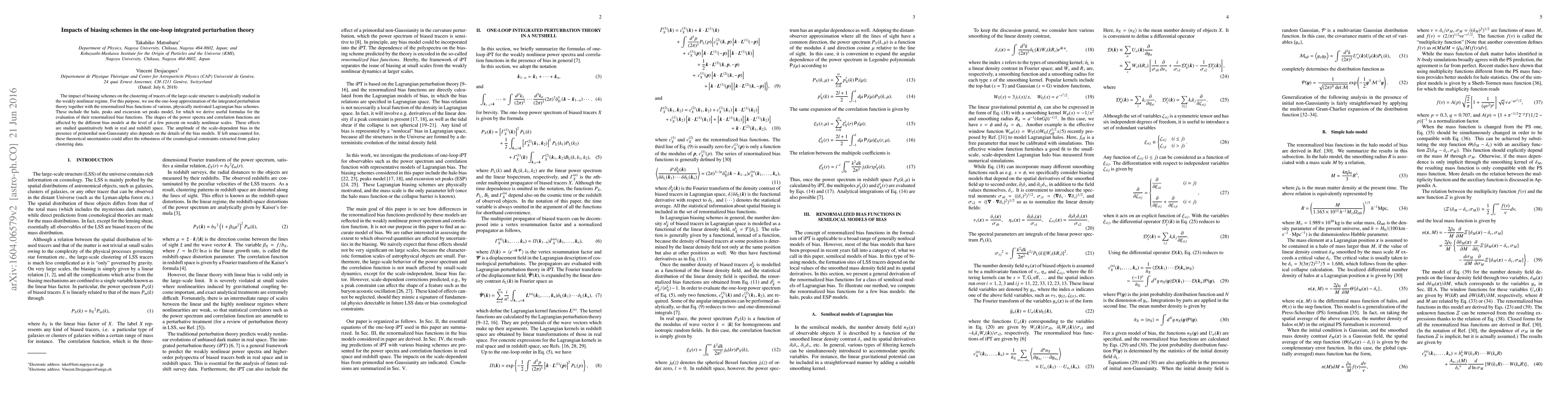 This paper analyzes the influence of various biasing schemes on the clustering of large-scale structure tracers using one-loop integrated perturbation theory. It finds that different bias models, including halo, peaks, and excursion set peaks, affect power spectra and correlation functions by a few percent, potentially impacting cosmological constraints derived from galaxy clustering data.