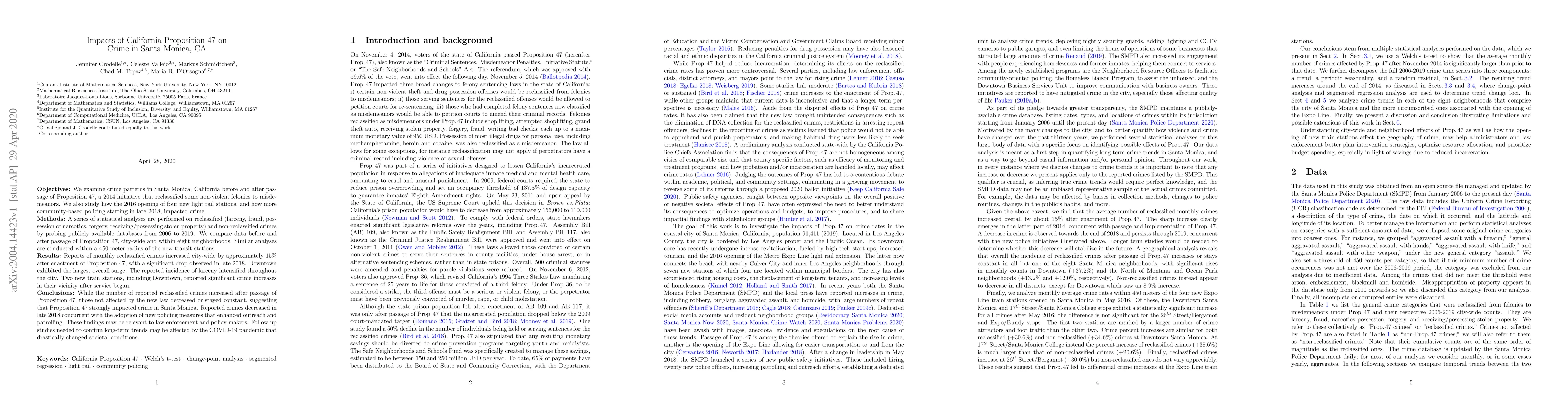 We examine crime patterns in Santa Monica, California before and after passage of Proposition 47, a 2014 initiative that reclassified some non-violent felonies to misdemeanors. We also study how the 2016 opening of four new light rail stations, and how more community-based policing starting in late 2018, impacted crime. A series of statistical analyses are performed on reclassified (larceny, fraud, possession of narcotics, forgery, receiving/possessing stolen property) and non-reclassified crimes by probing publicly available databases from 2006 to 2019. We compare data before and after passage of Proposition 47, city-wide and within eight neighborhoods. Similar analyses are conducted within a 450 meter radius of the new transit stations. Reports of monthly reclassified crimes increased city-wide by approximately 15% after enactment of Proposition 47, with a significant drop observed in late 2018. Downtown exhibited the largest overall surge. The reported incidence of larceny intensified throughout the city. Two new train stations, including Downtown, reported significant crime increases in their vicinity after service began. While the number of reported reclassified crimes increased after passage of Proposition 47, those not affected by the new law decreased or stayed constant, suggesting that Proposition 47 strongly impacted crime in Santa Monica. Reported crimes decreased in late 2018 concurrent with the adoption of new policing measures that enhanced outreach and patrolling. These findings may be relevant to law enforcement and policy-makers. Follow-up studies needed to confirm long-term trends may be affected by the COVID-19 pandemic that drastically changed societal conditions.