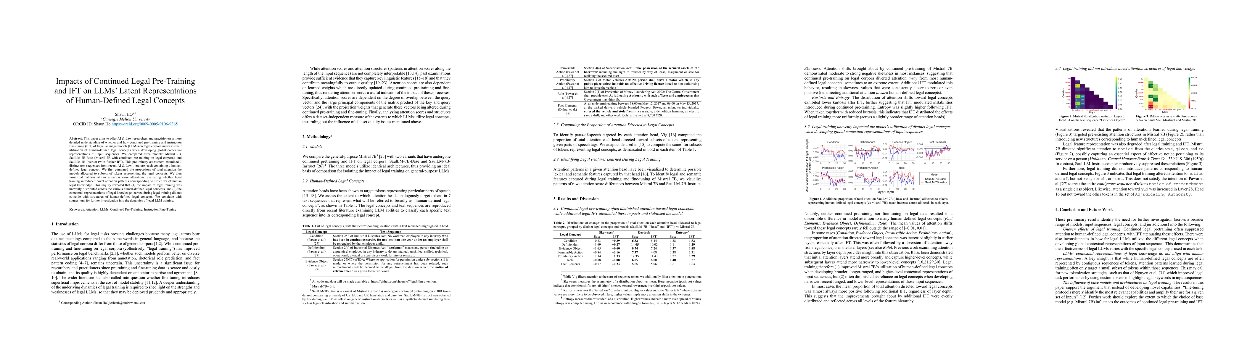 This paper aims to offer AI & Law researchers and practitioners a more detailed understanding of whether and how continued pre-training and instruction fine-tuning (IFT) of large language models (LLMs) on legal corpora increases their utilization of human-defined legal concepts when developing global contextual representations of input sequences. We compared three models: Mistral 7B, SaulLM-7B-Base (Mistral 7B with continued pre-training on legal corpora), and SaulLM-7B-Instruct (with further IFT). This preliminary assessment examined 7 distinct text sequences from recent AI & Law literature, each containing a human-defined legal concept. We first compared the proportions of total attention the models allocated to subsets of tokens representing the legal concepts. We then visualized patterns of raw attention score alterations, evaluating whether legal training introduced novel attention patterns corresponding to structures of human legal knowledge. This inquiry revealed that (1) the impact of legal training was unevenly distributed across the various human-defined legal concepts, and (2) the contextual representations of legal knowledge learned during legal training did not coincide with structures of human-defined legal concepts. We conclude with suggestions for further investigation into the dynamics of legal LLM training.