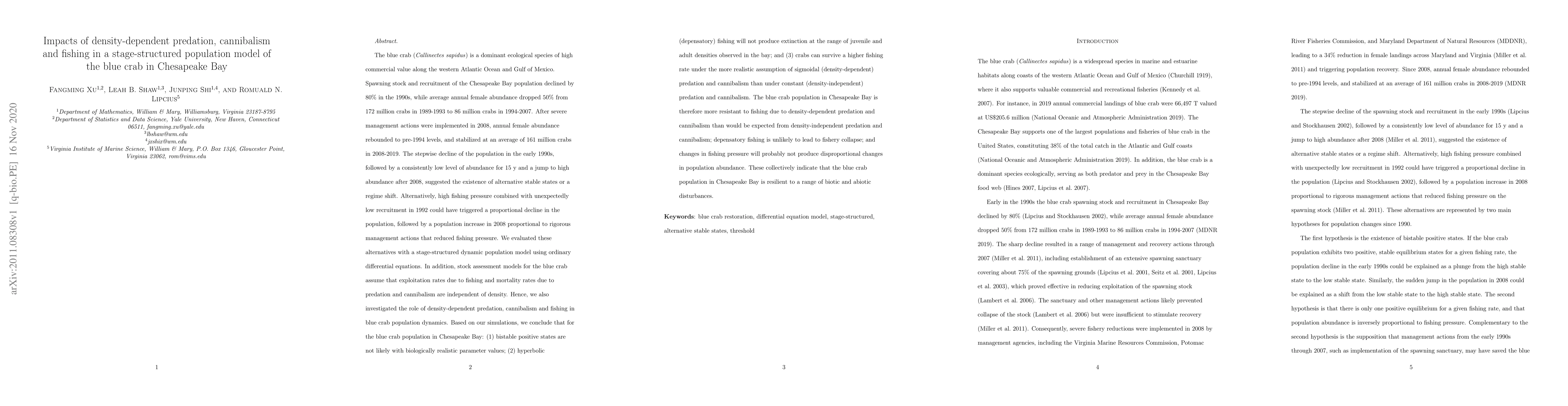 This study examines the dynamics of the blue crab population in Chesapeake Bay, considering density-dependent predation, cannibalism, and fishing. The findings suggest that the population is resilient, with no evidence of bistable states, and that high fishing rates can be tolerated under realistic density-dependent predation and cannibalism scenarios.
