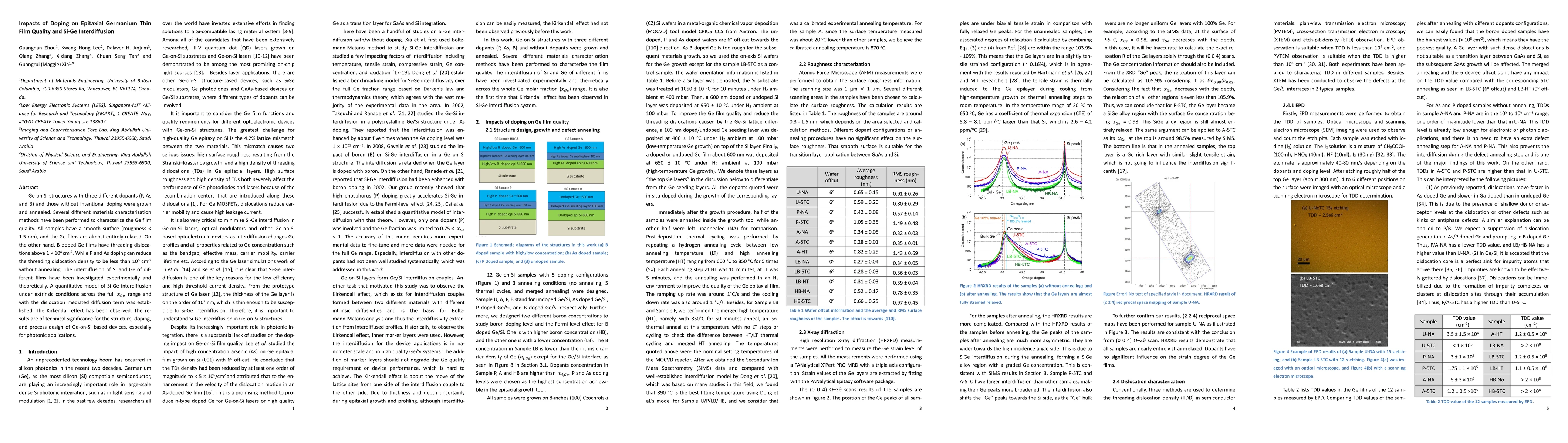This paper investigates the effects of different doping agents (P, As, B) on the quality of epitaxial germanium thin films on silicon substrates and the interdiffusion of Si and Ge. The study finds that B doping increases dislocation density, while P and As doping can reduce it, and establishes a model for Si-Ge interdiffusion, highlighting the importance of these findings for Ge-on-Si device design.